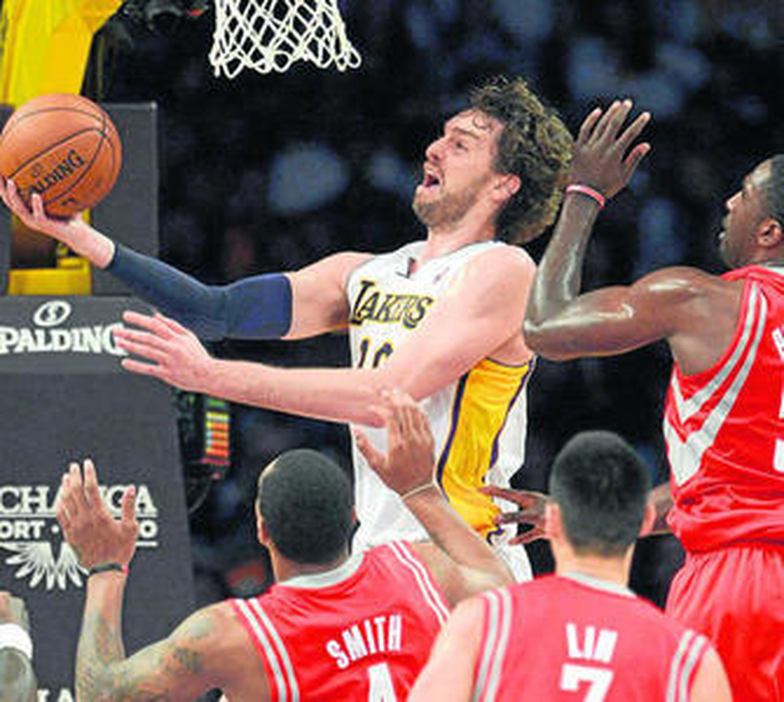 Los Lakers siguen con su particular lavado de cara desde el fichaje del técnico Mike D'Antoni, que sólo suma victorias. La última fue ante los Rockets (119-108), gracias a las sobresalientes actuaciones de Kobe Bryant y Dwight Howard en una noche histórica para Pau Gasol, que alcanzó los 15.000 puntos en la NBA. Bryant firmó su decimoctavo triple-doble de su carrera con 22 puntos, 11 rebotes y 11 asistencias, mientras que Howard, con 28 puntos y 13 rebotes, confirmó que cada día se acerca más a un estado de forma óptimo.