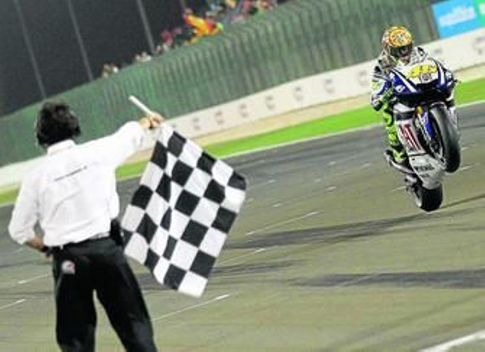 Valentino Rossi (Yamaha) se adjudicó el primer triunfo del año en MotoGP en la carrera nocturna de Qatar, firmando su primera victoria bajo los focos de Losail en una carrera en la que su moto se quedó sin gasolina tras cruzar la meta y su compañero Jorge Lorenzo le secundó en el podio, todo un logro tras la lesión que arrastró gran parte de la pretemporada.