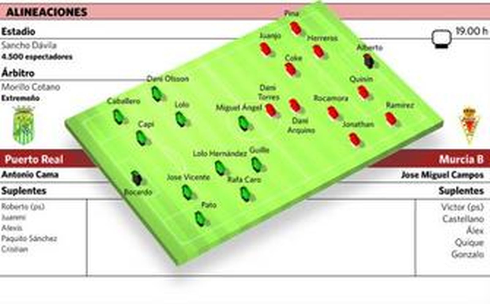 En lo que respecta al cuadro murciano, cabe reseñar que desde el pasado viernes se encuentra hospedado en un hotel de El Puerto de San María, de cara al partido de esta tarde. Así, el filial murcianista realizó en la mañana de ayer la última sesión preparatoria en uno de los campos de las instalaciones de El Rosal. Las principales novedades que tienen los pimentoneros será la presencia del torito Aquino y Dani Sánchez. El primero de ellos se perdió el primer encuentro al estar convocado con la selección nacional sub'19, mientras que el segundo por problemas físicos no pudo disputar el choque de ida. En este sentido, todo apunta de que el once que disponga José Miguel Campos no varíe mucho del que saltó en Molina de Segura, tan sólo la presencia de Aquino en la media punta. El que no estará será Borja Pando, que sigue recuperándose de una pequeña rotura fibrilar en sus gemelos que también le privó de actuar en tierras murcianas.