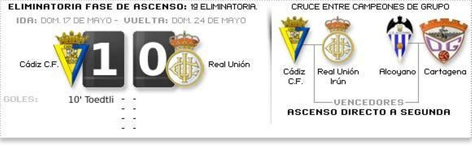 Ganó el Cádiz gracias al tanto de Toedtli en la primera parte. Buen resultado para afrontar la vuelta en Irún dentro de siete días, aunque por el desarrollo del partido los cadistas hubieran merecido un resultado más holgado para su viaje a tierras vascas. No pudo ser y el próximo domingo se verá si este 1-0 es suficiente para que los de Javi Gracia retornen a la categoría de plata.