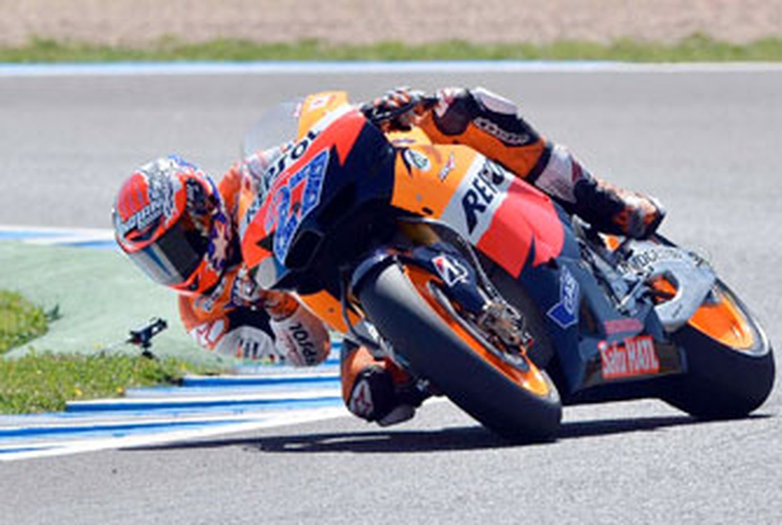 El australiano Casey Stoner (Honda RC 212 V) puso a todos sus rivales en su sitio al conseguir el mejor lugar de la formación de salida del Gran Premio de España de MotoGP tras ser el más rápido en los únicos entrenamientos oficiales que se realizaron en el circuito de Jerez y que resultaron muy accidentados.