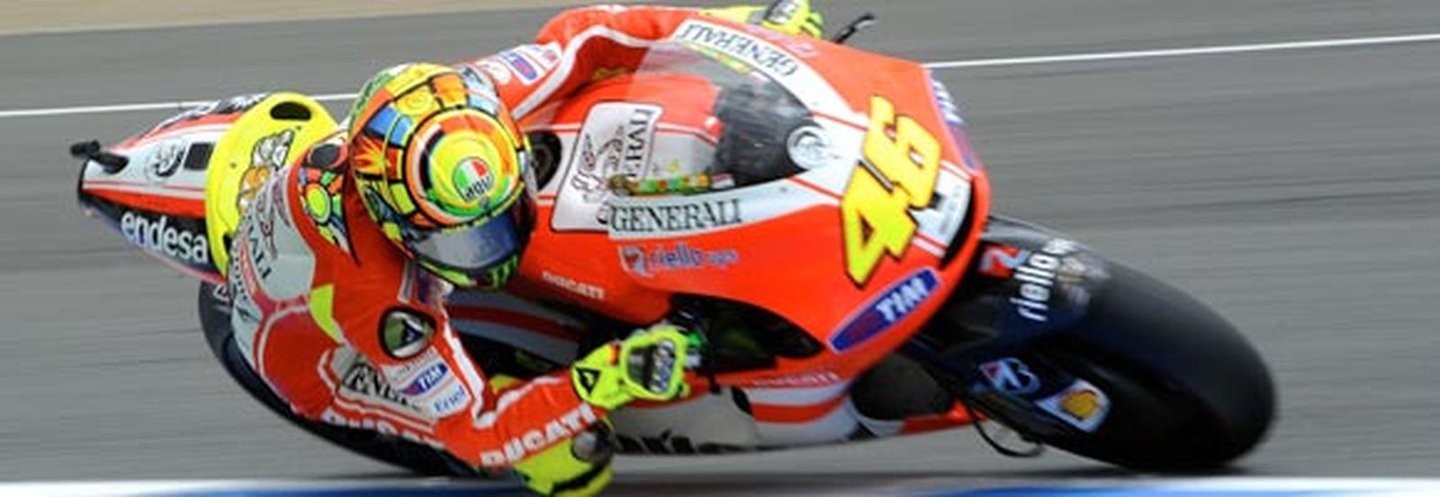 Antes de cumplirse el primer tercio de los entrenamientos ya se había ido por los suelos, al perder contacto con el suelo la rueda delantera de su Ducati Desmosedici, el nueve veces campeón del mundo Valentino Rossi, quien regresó en a su taller a por la segunda moto.