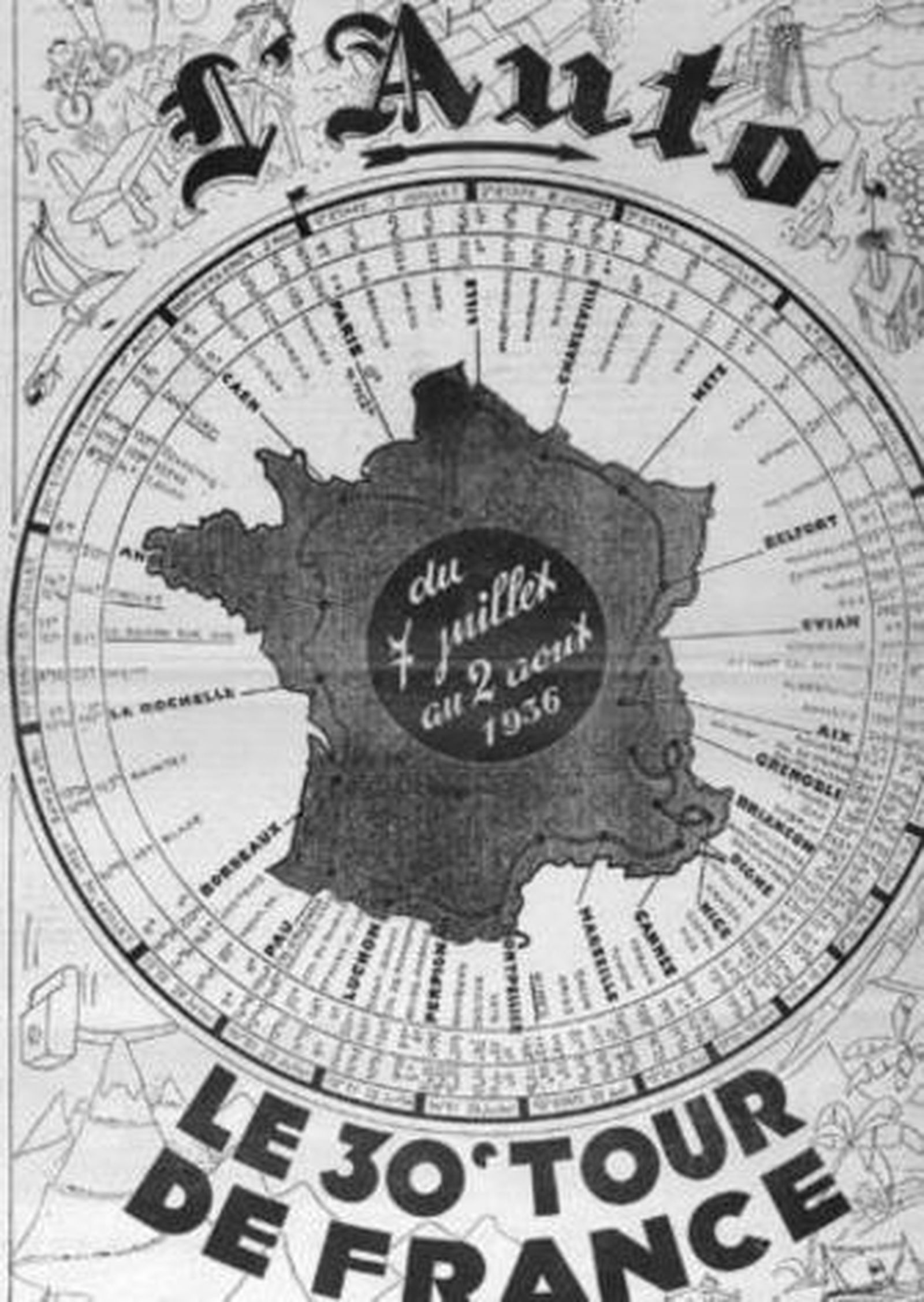 El Tour era ya en 1936 un fenómeno mediático, quizá porque había nacido en la redacción de un periódico. En 1903 el periodista de "L'Auto", Géo Lefévre ideaba una vuelta en bicicleta alrededor de Francia con el fin de relanzar las decaídas ventas del rotativo parisino, que narraría cada etapa en tono épico. La bici en 1903 representaba moderno, el progreso y la velocidad, y "la plus grande épreuve cycliste jamais organisée" le proporcionaría el refrendo definitivo.