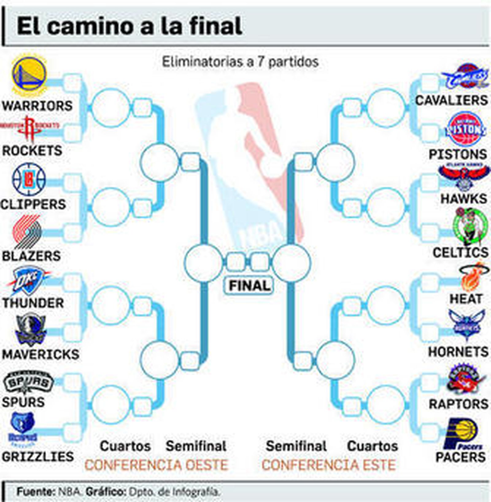 Ahora, los actuales campeones, líderes de la Conferencia Oeste, iniciarán las eliminatorias por el título midiéndose a los Houston Rockets de James Harden y Dwight Howard, reeditando en primera ronda la final del Oeste del pasado curso, mientras que los Spurs, segundos en la conferencia, se medirán precisamente con los Grizzlies. En el Este, los Cavaliers, campeones, iniciarán los play off ante los Pistons; los Raptors, ante los Pacers; y los Heat, frente a los Hornets.