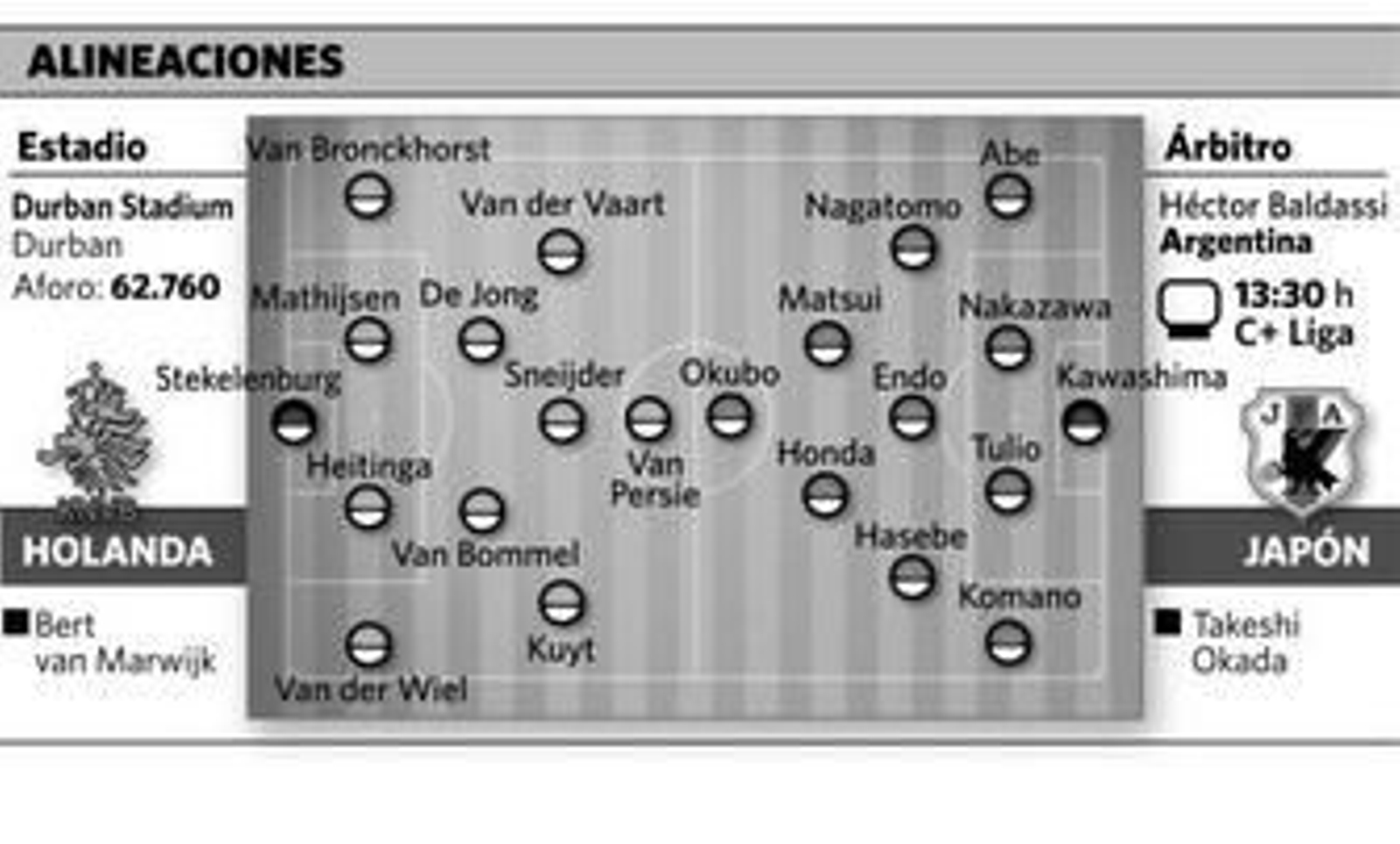 Sin embargo, el tres veces campeón asiático no le ganó nunca a los holandeses. La última vez cayeron ante los oranje por 3-0 en un amistoso en septiembre de 2009. "El resultado engaña. Los japoneses tienen un equipo fuerte", advirtió Bert van Marwijk. El entrenador de los naranjas posiblemente pondrá en el campo al mismo equipo que venció a los daneses. También dará una nueva oportunidad a sus dos estrellas, Van der Vaart y Robin van Persie, cuyo rendimiento no convenció en el primer partido.