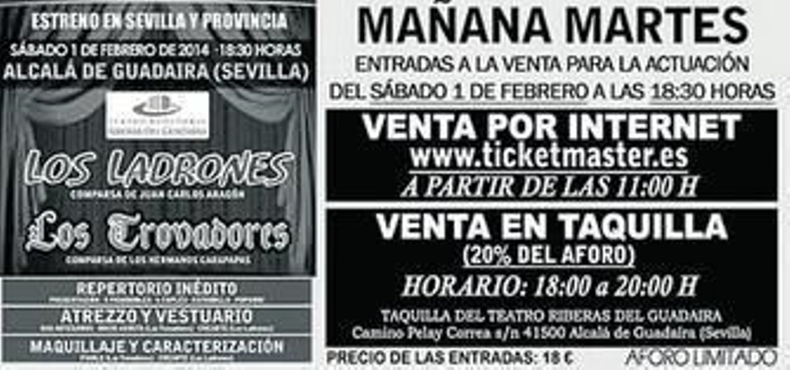 Hoy es el día del estreno de las comparsas de Juan Carlos Aragón, 'Los ladrones', y de los hermanos Márquez Mateo Carapapas, 'Los trovadores'. El espectáculo conjunto de estas dos agrupaciones que decidieron no participar en el Concurso del Falla comenzará a las 21.30 horas en el Teatro Auditorio Riberas del Guadaira, de la localidad sevillana de Alcalá de Guadaira. Dos horas y media de función para dos comparsas que se presentarán con un repertorio completo, atrezzo y caracterización como si el debut fuera en el Falla. Así lo harán por todos los teatros en los que girarán en febrero. Javi Bohórquez, director de la comparsa de Aragón, explica que de los 16 teatros anunciados, en 10 se ha colgado el cartel de 'no hay billetes'. Uno de ellos es el del estreno, donde ofrecerán esta noche una función y mañana dos, una de tarde y otra de noche. El aforo es de 935 personas. Bohórquez, sin adelantar nada, como es lógico, anuncia una comparsa, 'Los ladrones', "reivindicativa y a tono con lo que está ocurriendo". Sobre el espectáculo dice que "se han invertido muchas horas y mucho dinero para llevar a los aficionados nuestra obra". Ambas comparsas venderán ya esta noche sus respectivos cd.