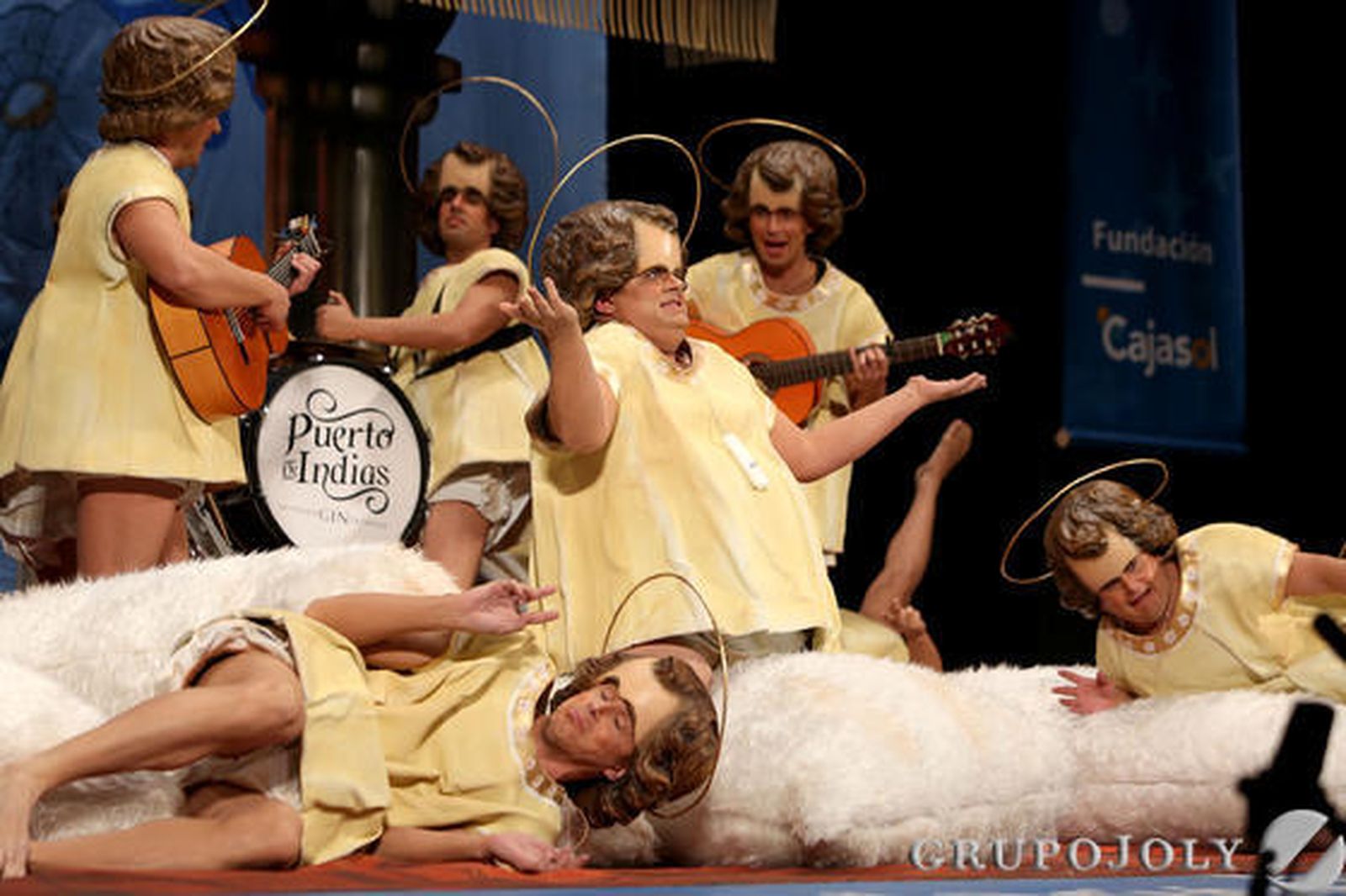 Antes del descanso, turno para el humor de la mano del Canijo, que acertó en sus pasodobles a las absurdas disputas entre cargadores y costaleros y a los casos de pederastia en la iglesia, siempre desde el punto de vista del tipo. No desentonaron los cuplés, ambos mejor desarrollados que rematados. Destacó el segundo, a su obsesión por las comparsas, con buenos golpes intermedios (después de escuchar a ‘Los chatarra’ fueron al punto limpio a gritarle “olé”). El popurrí convence.