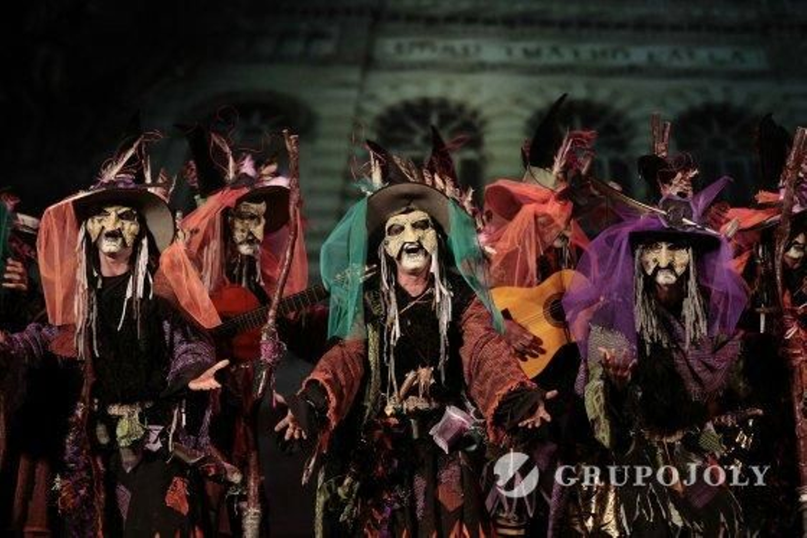 Las coplas. Susurros para empezar, campanillas... Van creando el clima a oscuras... Bonita cadencia en la presentación que va tomando intensidad pero sin llegar a terminar en rabia. Sí con los versos. "En este Cádiz hay muchas más brujas que yo". Un ramito de romero para un homenaje en el primer pasodoble. Mientras cantan, los comparsistas van depositando la ofrenda en la escena para el desaparecido Pedro Romero. La letra es un tributo sentido pero que cobra más dimensión en el remate, "el que se ha ido no era un extraño, era uno nuestro", que en el desarrollo más convencional. La crítica se la reservan para la segunda letra, al PSOE, "una izquierda de mierda" sentada a la mesa de un restaurante de "cinco tenedores" y para los sindicalistas que han vendido al obrero, y para todos aquellos "que han permitido que nos gobierne de nuevo Franco". En el primer cuplé hacen un puchero con su varita. Picarón, está simpático. En el segundo la compañías telefónica se la "meten" a la alcaldesa pero,como en el juego de la patata caliente, "ella nos la mete a nosotros con los impuestos". Bonito juego de voces en el estribillo. De hecho el riesgo en música y musicalidad son los puntos fuerte de esta comparsa. Se hace patente en el popurrí.