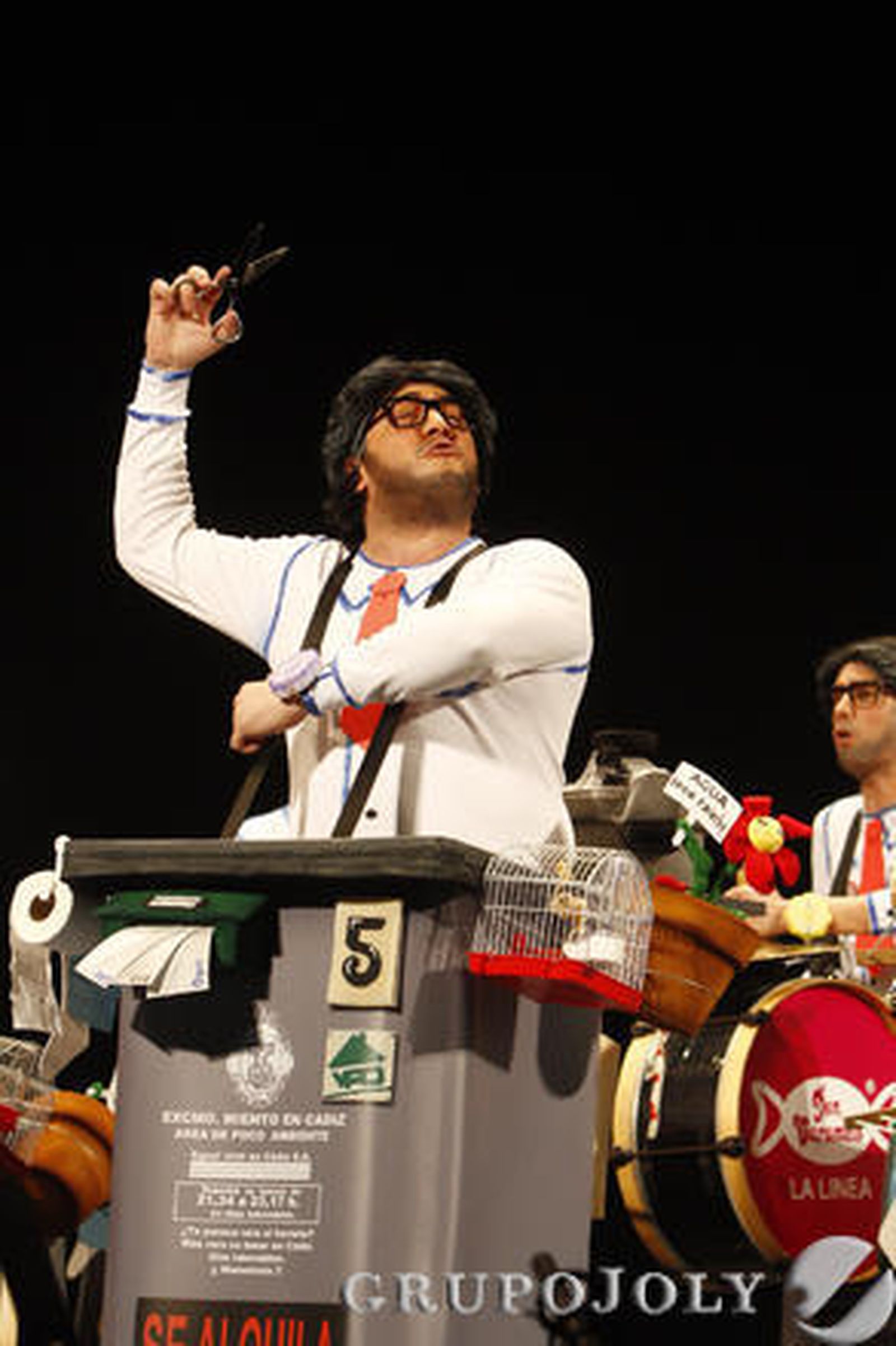 Las coplas. Vienen muy fuertes. Gran pase el de estos chirigoteros que cuidan cada detalle de su repertorio. Eso no es nuevo. Pero sí el calado de las letras. Traen a esta fase preliminar piezas potentes. Tras una gran pancarta que reza, "no más recortes", se presentan para ocultar su casa que es un bidón de basura. "La cosa está fatá". Y tanto... Llevan los coloretes "de pega" para usarlos otra vez si pasan de fase. La presentación va de más a menos. Intercambio rápido de pareceres entre Remolino y Julio para hacer su típica introducción a los pasodobles, los dos con mensaje a Rajoy. También mantienen su clásica estructura. Mitad cómico, mitad crítico. Recortes en Carnaval es el tema del primero. Hasta la Tere ha tenido que recortar "que sigue vendiendo bocadillos pero no como le da la gana" o el millonario que ahora es "mileurista". Recortes y más recortes. Hasta su forillo está de luto. Pero espetan al presidente: "Me va a tener que recortar la lengua para que me calle". El segundo pasodoble, si cabe, tiene más calidad que el primero. Recortes en Sanidad. Los anestesistas duermen a los pacientes con una nana. A Los Cristalitos los van a contratar como sirenas de las ambulancias. Señor Rajoy, vaya usted "al cardiólogo" porque "le falla el corazón si es que tiene", o al neurólogo si le falla el cerebro. "Pero quien recorta la salud del otro lo que le hace falta es un psiquiatra porque usted está loco", rematan. Calidad. Buen recurso para ilustrar lo cortito que andamos con el pito de los cuplés. Comparten uno. Buena primera letra a los Reyes Magos andaluces (el de Cádiz le diría a San José: "Toma Pepe, mi currículum por si hay algo en la carpintería") mientras que la segunda es más flojita, sobre el libro Cincuenta sombras de Grey . Regulero. Estribillo concursero con las tijeras de 'Los tijeritas': "Te la regalo Rajoy y recortate un huevo". Popurrí muy distraido y con cosas de arte. Además de la cuarteta final con recuerdo para el "trabajar, trabajar" que creara Pedro Romero para 'Nuestra Andalucía', con muchos colectivos sociales en forma de protesta.