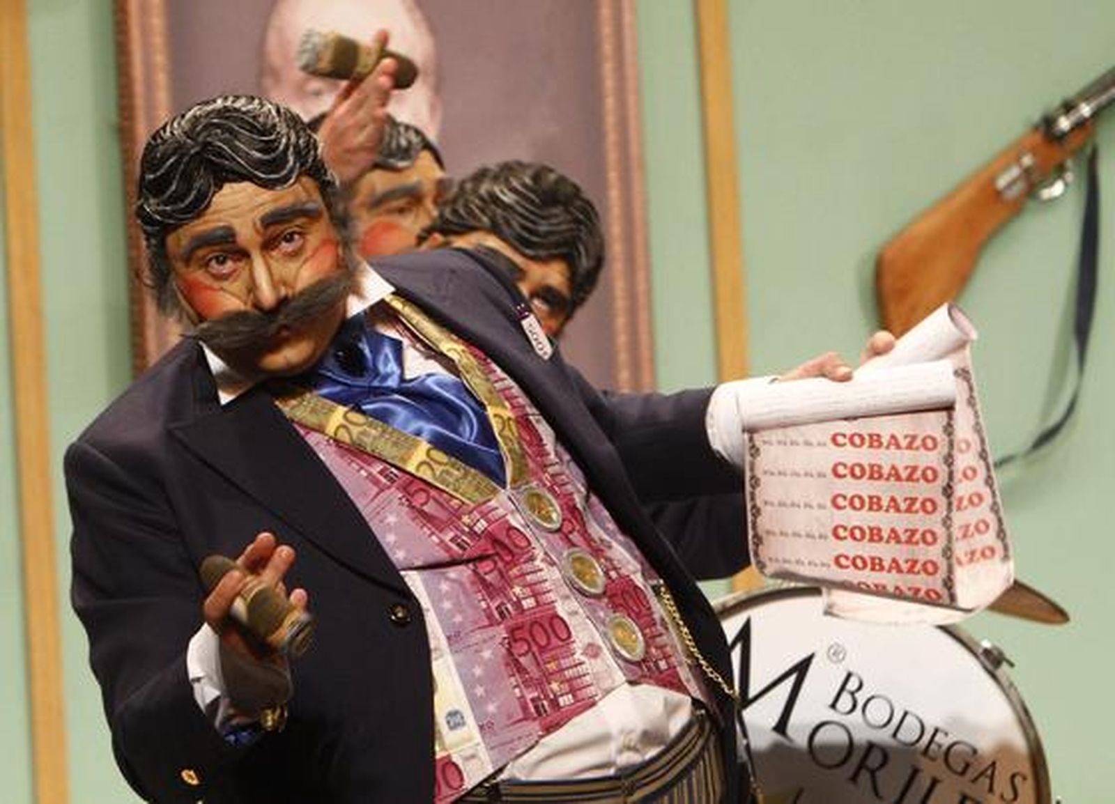 Letra, música y dirección. José Luis García Cossío. Las coplas. “¿Tú ves como está la cosa?, pues mejor se va a poner...”, se relamen estos banqueros que atesoran caudales de ironía. Aunque menos conjuntados, interpretan dos buenos pasodobles. El segundo, sobre todo, para enmarcarlo. Aunque el equipo de fútbol local sirve de cachondeo con frecuencia, Selu toca el tema con la excelencia de los grandes delanteros. Ahora con el Carranza arreglado esas “grandes figuras” podrán desarrollar un buen fútbol, dicen con guasa para dar caña a un portero “solidario” que mete goles en propia puerta o a un presidente “que es Juan Carlos Aragón”. “Le falta clase al Cádiz para que le puedan decir chirigota, chirigota”, rematan, tremendos. En el primero, una pareja pide una hipoteca. Los banqueros le dicen al chico que debería de quererlo a él más que a su mujer “porque el amor dura dos días pero la hipotequita que te acabo de meter es para toda la vida”. Ole. Cuplé gravitatorio y, mejor, a Sánchez Gordillo a quien se une cuando ve lo que le cuesta una compra de procutos de gourmet. El popurrí desmereceun pase casi redondo.