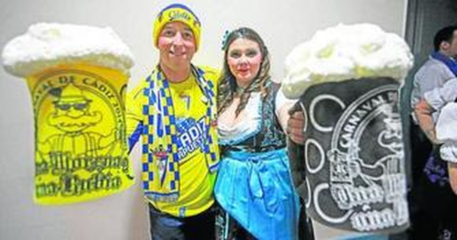 Coristas de 'Una morena y una rubia' actuaron ayer en el Falla con camisetas y bufandas del Cádiz, idea con la que solventaron que 13 de los tipos que habían pedido a Alemania no llegaran a tiempo para la noche del estreno en el Falla. Según contaron los coristas, que iban de alemanes con los trajes típicos en la fiesta de la cerveza, lo habían encargado en ese país con la intención de que fueran originales y lo más fidedignos posible. Sin embargo, uno de los cuatro paquetes que pidieron en un envío 'urgente' se extravió y lo mandaron en camión en vez de en avión como el resto. Ayer llegaron a Madrid pero ya no pudieron llegar a tiempo. "A pesar de los nervios pasados hemos hecho una actuación digna", apuntaron.