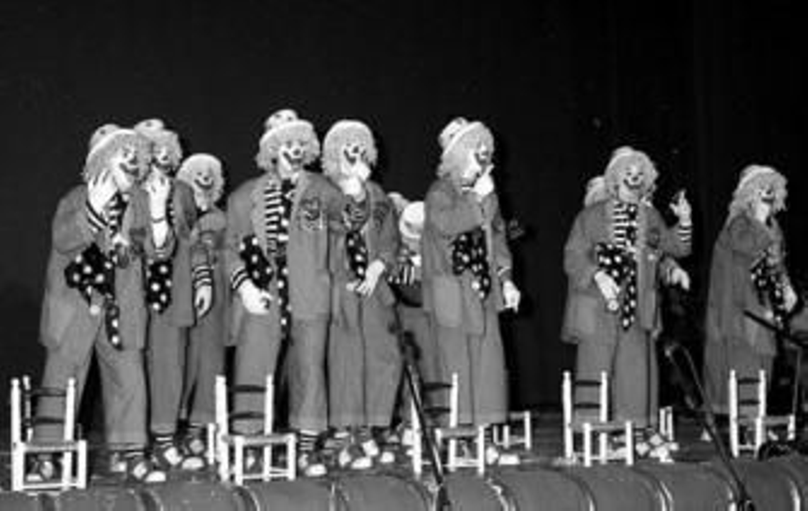Otra cosa, en la chaqueta, no la burdeos, la azul, a la altura del corazón llevábamos la típica flor de payaso que lanzaba agua. ¡Pero había más! Dejadas de caer en las orejas ocultábamos dos pequeños tubos que también salpicaban agua cuando queríamos aparentar que estábamos llorando, además de un reloj precioso y enorme y unos zapatones maravillosos. Todo eso nos los hizo Ángel, no el Zubiela, otro, un sibarita de la decoración y el buen gusto. En la espalda, además de la silla, había un laberinto de tubos que terminaban en dos perillas que accionábamos con las manos, la derecha era para el agua del corazón, la de la izquierda para los ojos. Y otra vez para El Puerto de Santa María, y otra vez el primer premio, qué pesadez. El verano fue muy intenso y compartíamos función con todos los grandes grupos del momento. Poco a poco nos hacíamos un hueco en la fiesta gaditana pero lo importante es que nosotros éramos felices, muy felices, lo que no fuimos muchos años después.