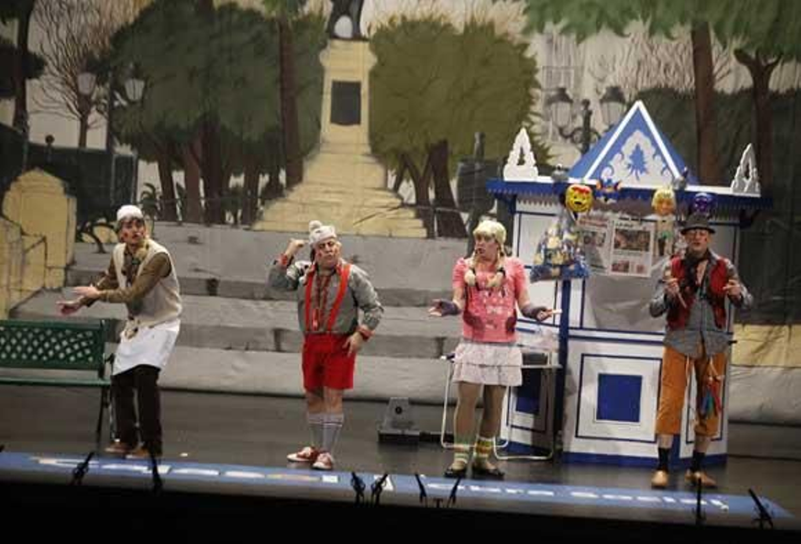 En cuartos: Oh,el quiosco está cerrado por defunción... que pena para Joselito. Pero no, que Paco y el tito siguen vivos, mientras Joselito sigue haciendo de las suyas y ganándose al público con su gracia. Su novia, la Susi, se queda embarazada y a ver quién se lo dice a don Antonio, su padre, un policía con muy poquita paciencia -y con el tipo de La Pasma, del año pasado-. Cuplés para la compra de entradas por internet y para una tele en 3D, mejor el segundo aunque un poco mascadito. A más con el tema libre, que empieza con un sorteo chafado por Manolito el gafe y sigue con don Antonio buscando el padre del niño de la Susi... con el juego 'Quién es quién'. Buenos golpes y al final precioso homenaje a Selu Piulestán, que cumple 18 años sobre las tablas. Emocionadísimo y abrazado por su hermano, autor del cuarteto, protagoniza uno de los momentos más emotivos vividos este año en el Concurso. Muy bueno el cuarteto.