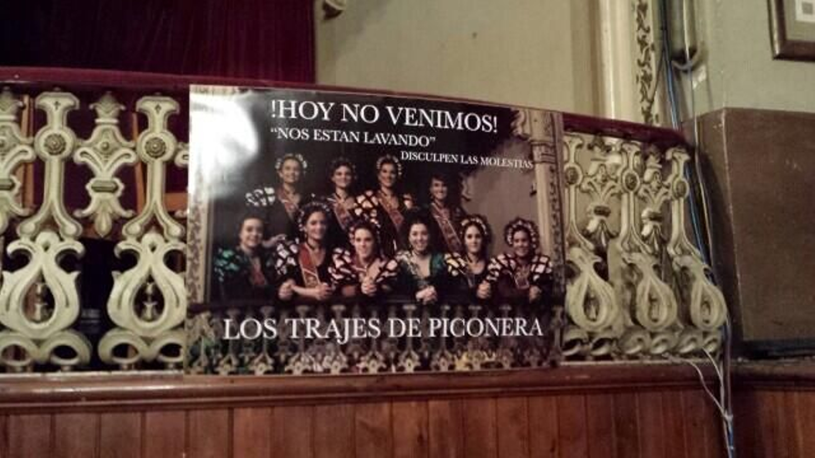 Tal y como hicieron hace algunos días los pregoneros, las ninfas han recurrido a un divertido cartel para anunciar que en esta fase no les acompañarán los trajes de piconera que han venido luciendo desde que comenzara el Concurso. '¡Hoy no venimos! "Nos están lavando, disculpen las molestias. Los trajes de piconera' reza el cartel que acompaña a las chicas en su palco.