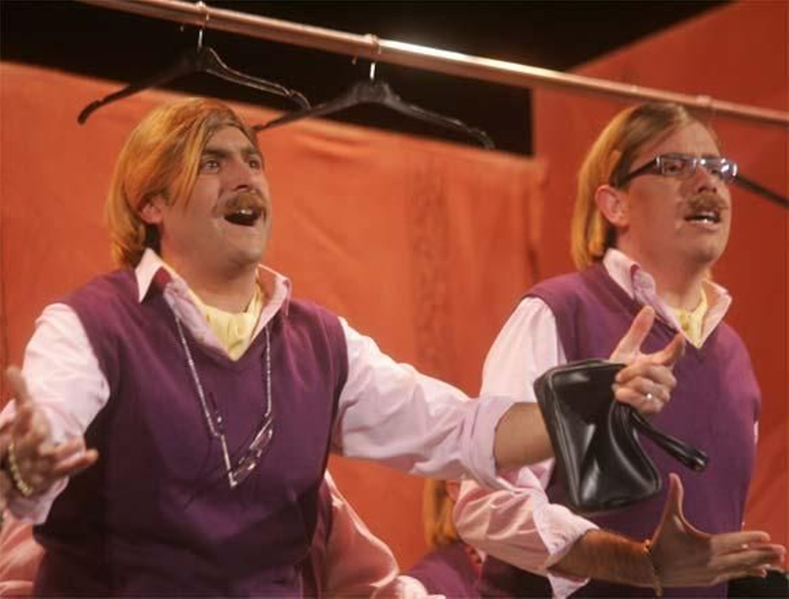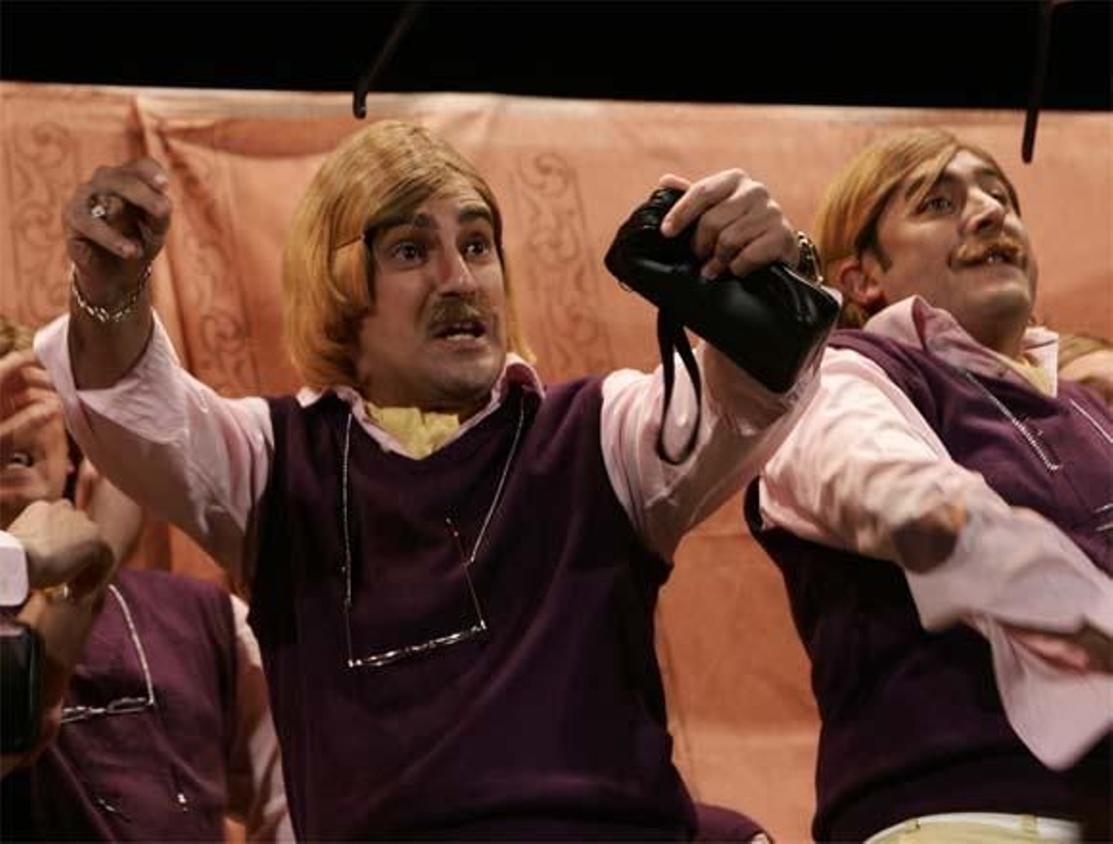 En preliminares: Desde dentro del armario pero muy dispuestos a salir llegan estos chirigoteros, con un bigotito y una melenita rubia que les hace parecerse a Schuster. Se entrega a ellos todo el teatro tras su primer pasodoble, dedicado a todos esos machotes que se meten con los homosexuales. "Hay más mariconas malas fuera del armario que dentro". Muy bueno también el segundo, en el que critican la imagen a veces forzada de graciosos y despreocupados que tienen los gaditanos y que ellos mismos se encargan de exportar. Certera letra. Bueno el primer cuplé, a los de Gran Hermano. Grata sorpresa la de esta chirigota, que viene bien surtida de letras. Segundo al coche tan moderno que se compraron, que sabe más que nadie. Gran cuplé y estribillo coreado por todo el público, ¡Igualdá! Igualdá, por delante que por detrá... Lección de doble sentido en el popurrí, de altura. Sorpresón, el público les despide al grito de ¡chirigota, chirigota! mientras ellos se marchan saliendo del armario, ahora sí. Habrá que seguirles en siguientes pases, pero hoy han estado geniales.