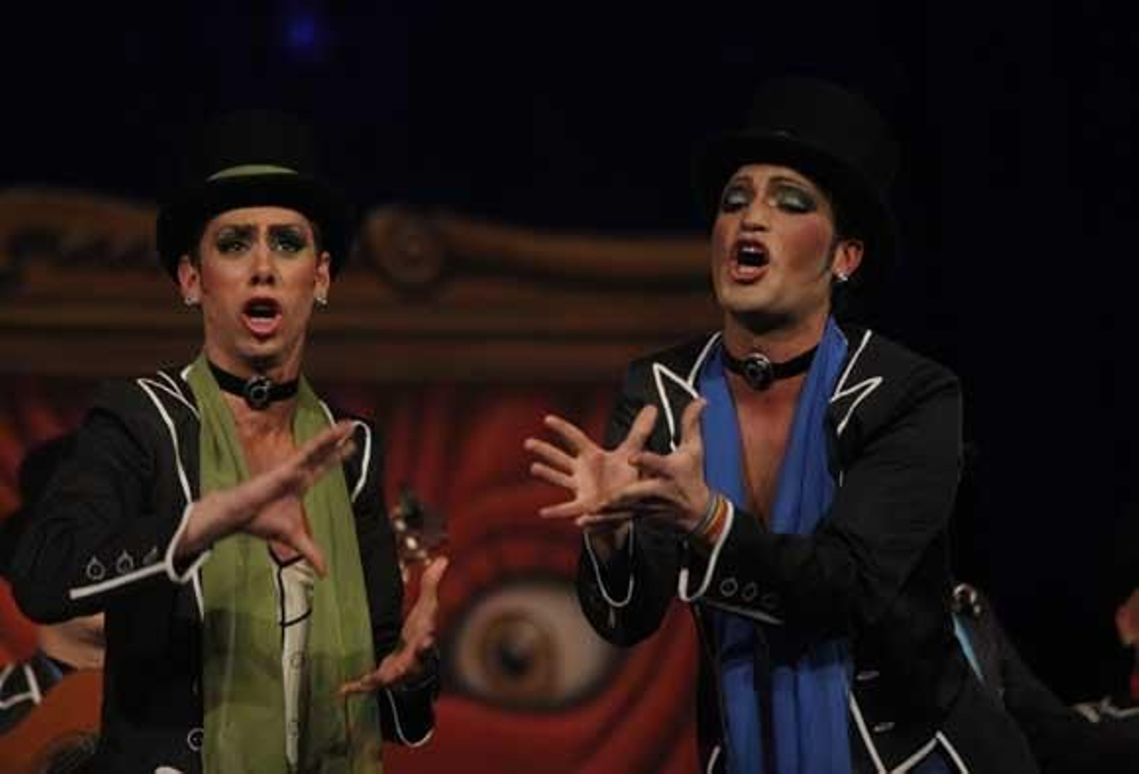 En preliminares: La comparsa de Tino Tovar arriesga con un tipo complicado, un personaje ambiguo, entre hombre y mujer, que recuerda a los maestros de ceremonias de un cabaret. El grupo de voces mejora respecto al pasado año y se nota desde la presentación, metida en el tipo. Los pasodobles, musicalmente y en letra de altura, van para explicar el tipo y para Pedro Romero, precioso homenaje al autor de Santa María. Divertidos cuplés para los cambios en el grupo y para la reportera de Onda Cádiz, Anabel Armario. Bonito también el popurrí, muy metido en el tipo tanto en letras como en música, y con un contenido de crítica y reivindicación de los homosexuales. Saben emocionar cuando hay que emocionar y divertir cuando toca reír. Una gran comparsa.