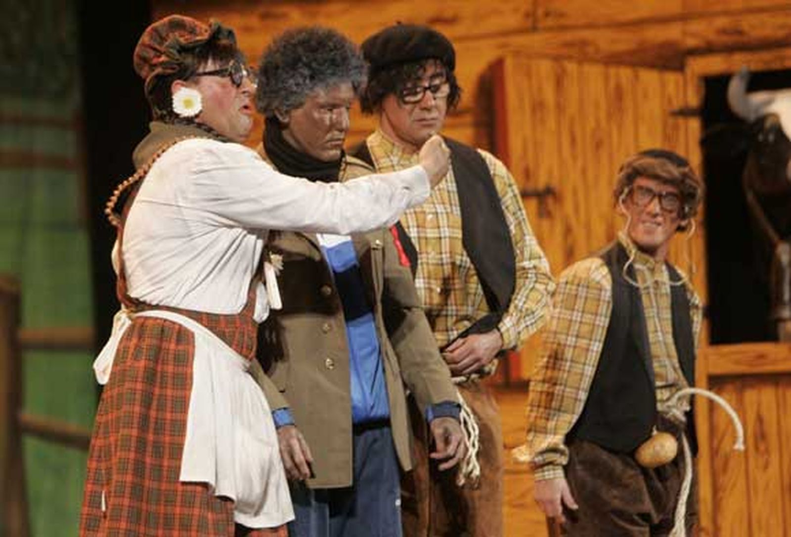 En cuartos: Los hermanos se llevan a un negrito al huerto, uno de los que vienen en 'paterna'. Socorro somete a un muchacho a un tercer grado y al final el chico se va porque lo tienen negro. Bastante más floja su parodia que la del primer pase. A ver los cuplés. Primero para las bombillas de bajo consumo, clavaditas al más pequeño del cuarteto. Regular. Segundo para el nuevo scaner que piensan poner en los aeropuertos, un poco mejor que el anterior. No acaban de despuntar. Para concluir repiten el popurrí de preliminares, muy trabajado.