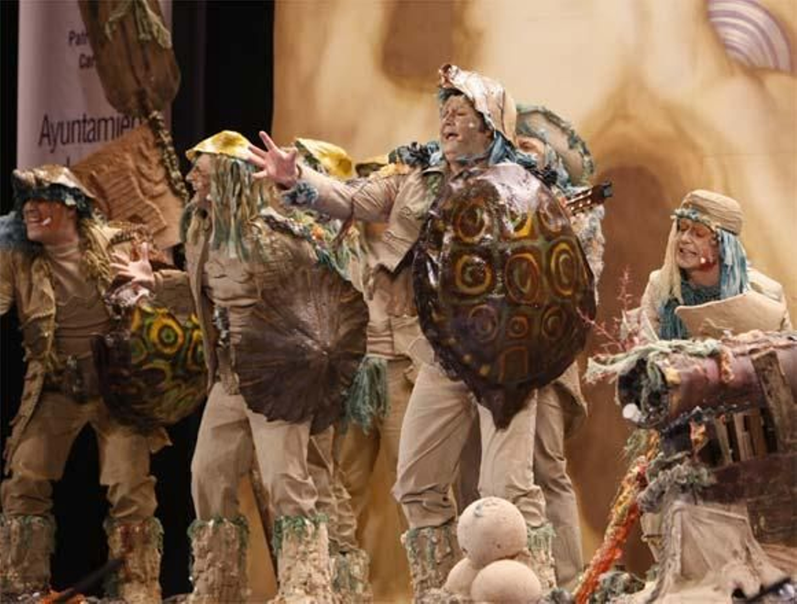 En preliminares: La comparsa algecireña hace demostración de voces y afinación en su presentación. Impresionante el tipo, con un traje de soldado del siglo XVIII hecho de arena y detalles marinos. Muy buena su presentación. En el primer pasodoble explican los elementos de su tipo: su espada es un coral, su escudo el caparazón de una vieja tortuga... Buena segunda letra en la que hablan de Cádiz como si de una vieja se tratara, que espera amargamente hasta el 2012 para que la cuiden mientras los políticos se pelean entre ellos. Tener el cuerpo de arena tiene sus desventajas... así lo cuentan en el primer cuplé. Segundo a Jesús Vigorra, que ellos lo nombraban presidente de Andalucía. Flojean un poco en los cuplés. Bien cantado el popurrí, relacionado con el tipo. Buena comparsa la llegada desde Algeciras.
