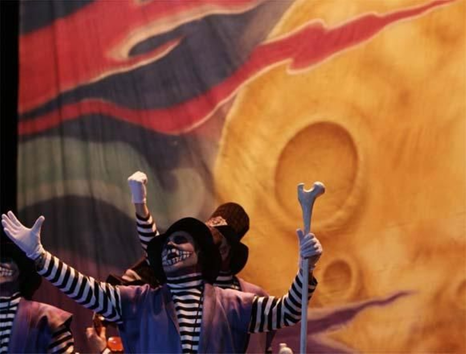 Tipo que parece surgido de una película de Tim Burton: calaveras con sombrero y una curiosa vestimenta. Comienzan un poco descompasados. Bonita música de pasodoble, que pierde con la interpretación. Comienza suave, y ahí le sacan partido, pero conforme va subiendo el tono va perdiendo afinación. Primer pasodoble a febrero, mes del Carnaval, y segundo a la Justicia, en un tono bastante escatológico. Primer cuplé a la obra de teatro de Martínez Ares, que le van a dar la del pulpo, dicen. Está simpático. Segundo para el rey Juan Carlos, mejor el primero. Bonita cuarteta en el popurrí dedicada a los últimos carnavaleros fallecidos, cinco estrellas más que brillan en el cielo. Mejoran en interpretación en esta última copla, que resulta musicalmente estupenda. El punto fuerte de su repertorio está en la música, no hay duda. Si tienen la oportunidad de volver y consiguen afinar un poco el grupo, pueden ser una agrupación a seguir.