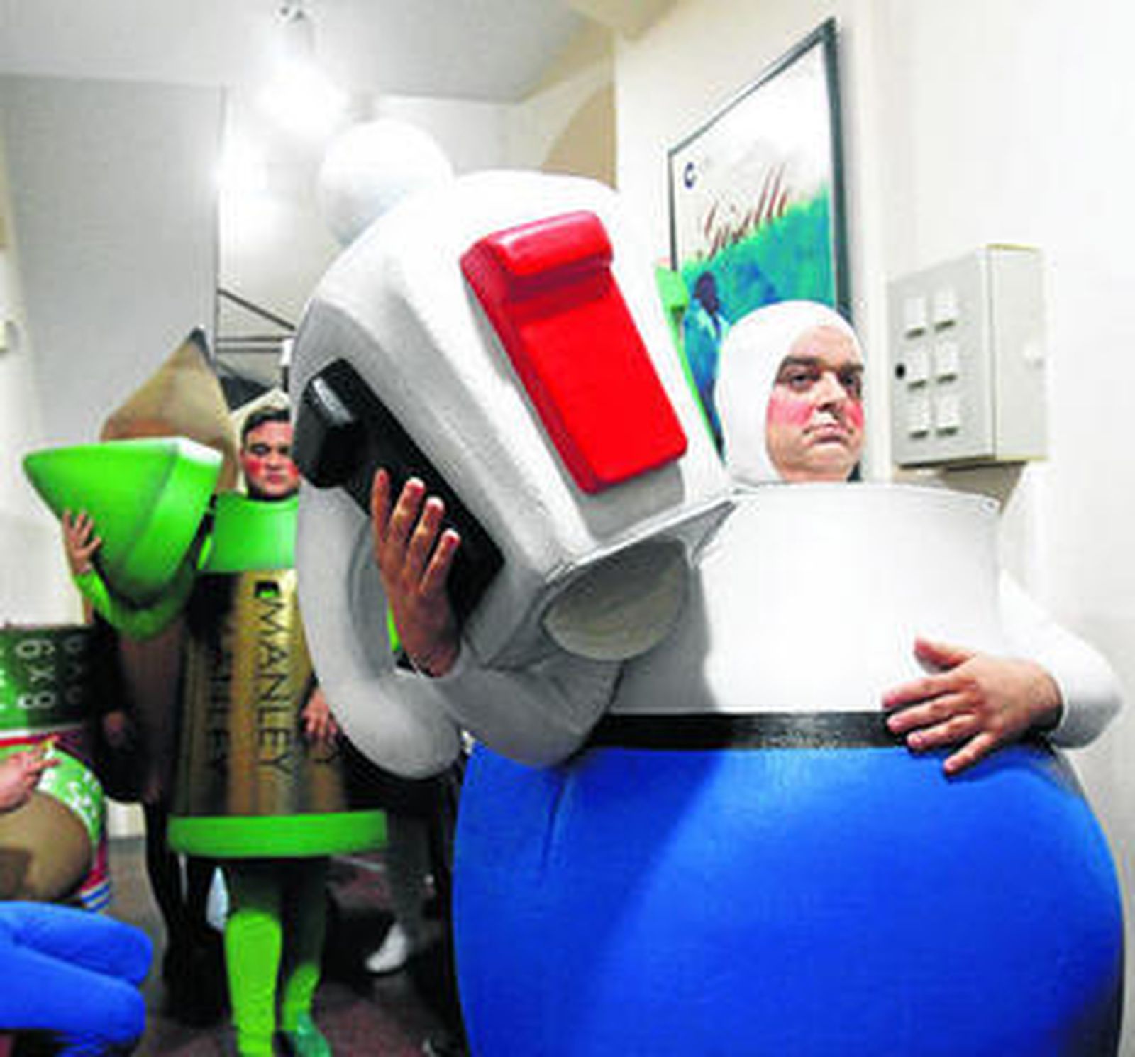 Los componentes de la chirigota de Antonio Pedro Serrano El Canijo saben que cada año se enfrentan a una aventura. ¿Cómo nos vestirá este gachó? Conocen de antemano que no irán de marineritos, ni de moritos, que es difícil que lleven un mono de astilleros o un tipito cómodo, es el precio que tiene salir con un autor al que le gustan los tipos novedosos. Por eso se han disfrazado de móviles, de frutas, de espermatozoides, de fetos y este año, de material escolar. "Eso es lo que hay, si no, ahí tienen otras chirigotas". Al preguntarle cómo se le ocurrió indica que "fue un poco paranoia; el año pasado sacamos un tipo que echó para atrás a algunas personas y este año queríamos volver a gustar en esta faceta, que no hiciera daño a nadie, así que como quería hablar de educación pues por mi cuenta empecé a confeccionar un repertorio, y ya cuando me di cuenta de que tenía material pues les comenté la idea". ¿Y cómo se lo tomaron? "Pues se quedaron con la boca abierta y pensaron, una vez más, este tío está loco. Pero luego saben que todo está supeditado a la idea, no es que me guste el foam especialmente, pero es que cómo se viste un tío de bolígrafo con un pantalón y una camiseta?, a ver. Además, en mi caso, es más difícil encontrar un pantalón de mi talla que hacerme un tipo de foam" (ríe).