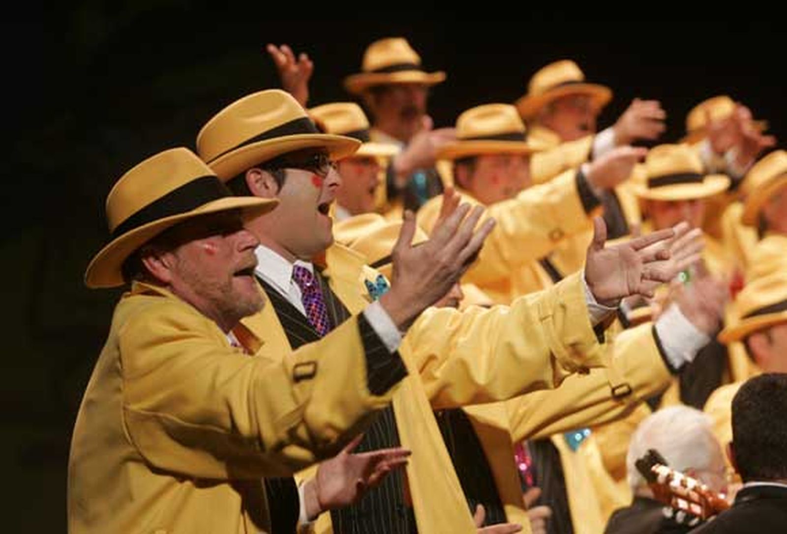 Nos trasladamos al Chicago de los años 30 para asistir a la lucha entre detectives y mafiosos, al más puro estilo Dick Tracy. Tango de corte clásico, el primero para la plaza de Abastos, que vuelve tras varios años parada a causa de las obras. Segundo en el que critican al Gobierno por no aportar soluciones a la crisis. La interpretación es mejorable. Primer cuplé para Maradona, que usa expresiones muy gaditanas. Simpático estribillo, pensado para las bateas y la calle. En el segundo no se meten con nadie... regulares los dos. Flojo popurrí, todo muy típico y a peor en cuanto a afinación... mucho colorido en su despedida, entre una nube de papelillos y serpentinas que anima al público.