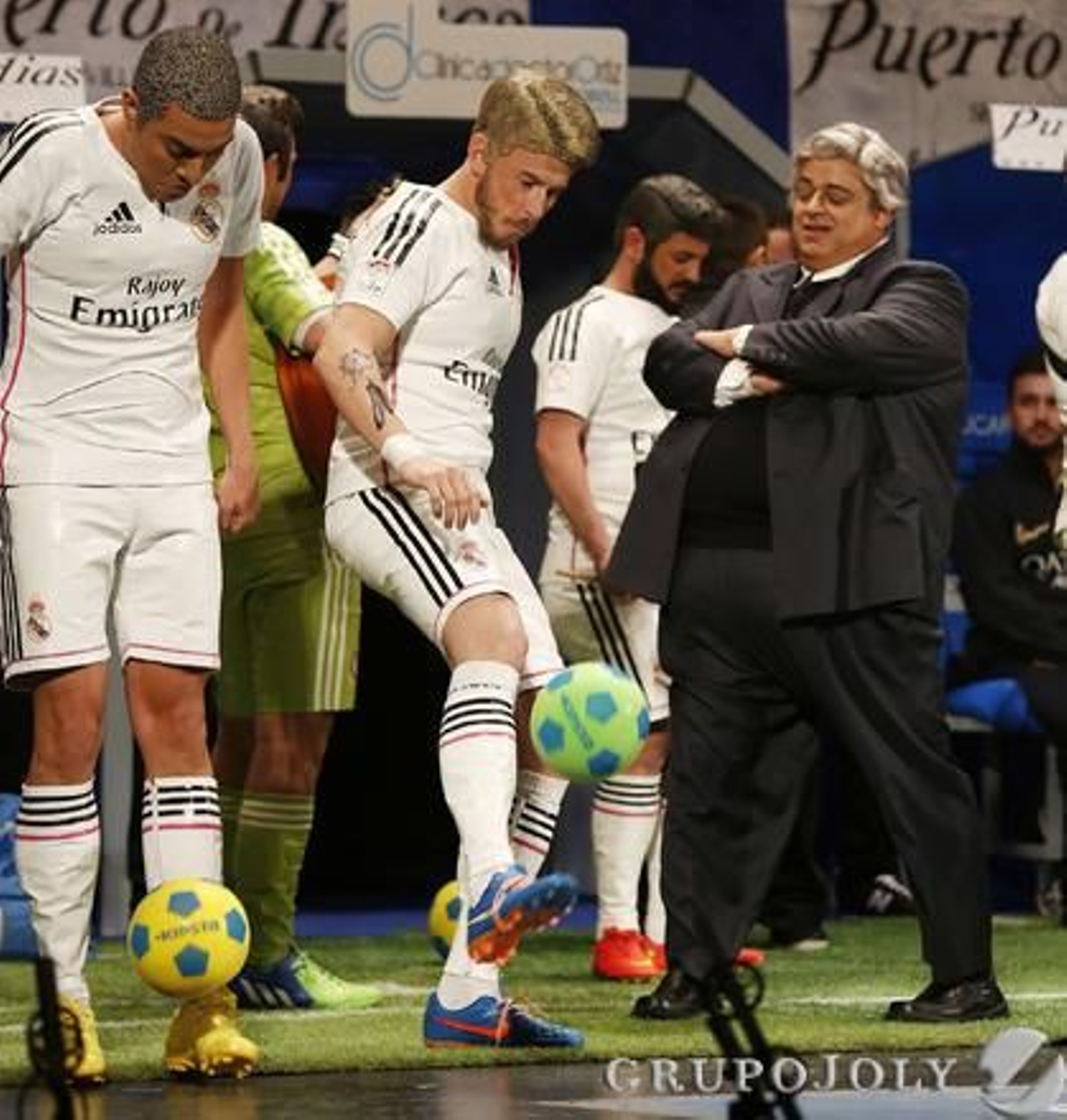 ¿Sergio Ramos es clavao no? Conseguidísima puesta en escena y gran trabajo de caracterización de los jugadores de los dos equipos que se reparten (con permiso del Atlético de Madrid) los corazones de gran parte del país. Presentación conseguida, además de por el impacto visual, por unos buenos detalles como que si les sacan tarjeta, que sea la "de Caja Madrid". Puesta de largo de jugadores, algunas con más ánge que otras. La más inteligente, la de Messi, que vomita mucho pero lo que no devuelve es lo de Hacienda. Cambios en esta chirigota. Además de variar la manera de entonar, que les favorece, algunos compañeros han dejado la agrupación y, a ellos, va el primer pasodoble, especialmente, quizás a uno de ellos que derrama lágrimas entre bambalinas. Letra (escrita a través de acertados símiles futbolísticos) de consumo interno pero de, quizás, sentimientos extrapolables. Mucho mejor, en cuanto al interés general del mensaje, el segundo pasodoble a la presidenta de la Junta de Andalucía. Susana Díaz espera un hijo y a las necesidades de ese niño apelan los chirigoteros para rematar que ojalá todos los demás puedan "disfrutar de los mismos derechos". Simpáticos cuplés. Sí, me han parecido resultones.