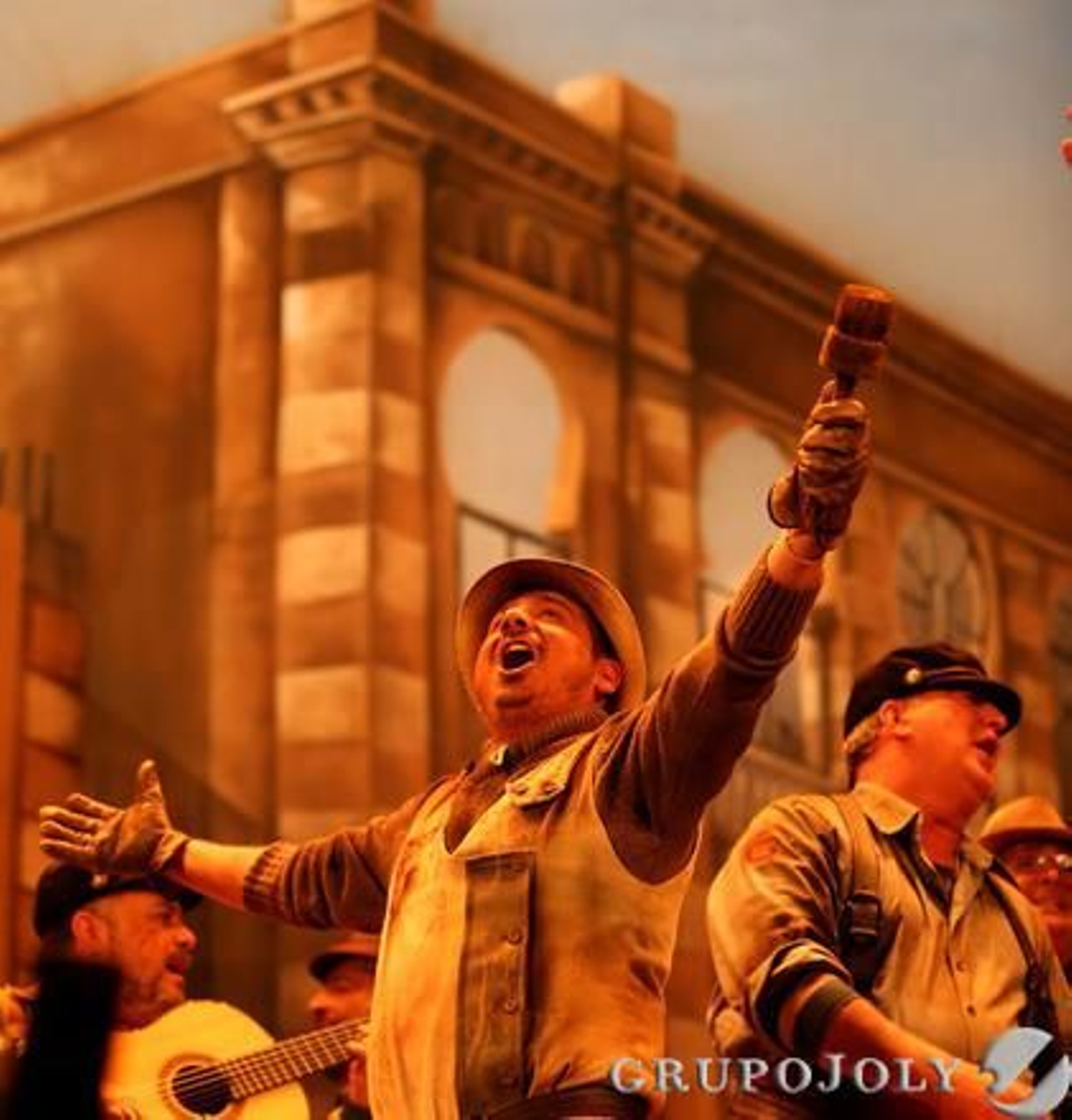 Sobre los "escombros y cenizas" se desmorona el viejo teatro de Cádiz y "la nueva cara del gigante gaditano" va tomando forma, el Gran Teatro Falla. Una comparsa que es un tributo a la joya de la Corona. Una comparsa bien cantada, con un grupo que construye el repertorio voz a voz, verso a verso. Qué bonita que suena. Buena presentación con los hombres trabajando con herramientas que marcan el compás. "Cádiz mi empresa, fuerza y voz". Pasodobles interpretados con mucha fuerza y con una melodía inseparable del nombre de su autor, con mucho gusto. Optan, sin embargo, por hacer hoy dos piropos. El primero, a Cádiz, que no hay que cantarle "por obligación o compromiso", le canta porque "es el beso a la madre que me hizo", cantan al comienzo y al final de una letra circular. Segundo tributo, a "don Antonio". A Martín le hablan y les "prestan" sus gargantas. "Cádiz te echa de menos porque falta tu comparsa". Los cuplés tienen ánge, ambos con remate al almacenero "fatiga" de abajo de su casa. El popurrí se pasea por las partes vistas del teatro con parada especial en el gallinero.