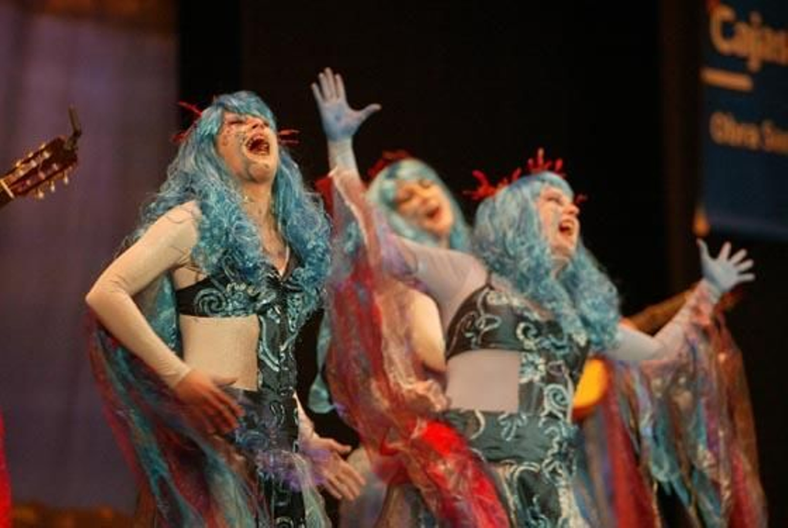 Original y muy trabajado el tipo de esta comparsa femenina de Barbate, de brujas del mar. Muy bonitas sus voces, y aunque al principio de su actuación les costó conjuntarse, mejoraron con los minutos. Grata impresión la que deja esta agrupación. Animado y ameno su popurrit, bien interpretado, y preciosas sus voces. Nota:**