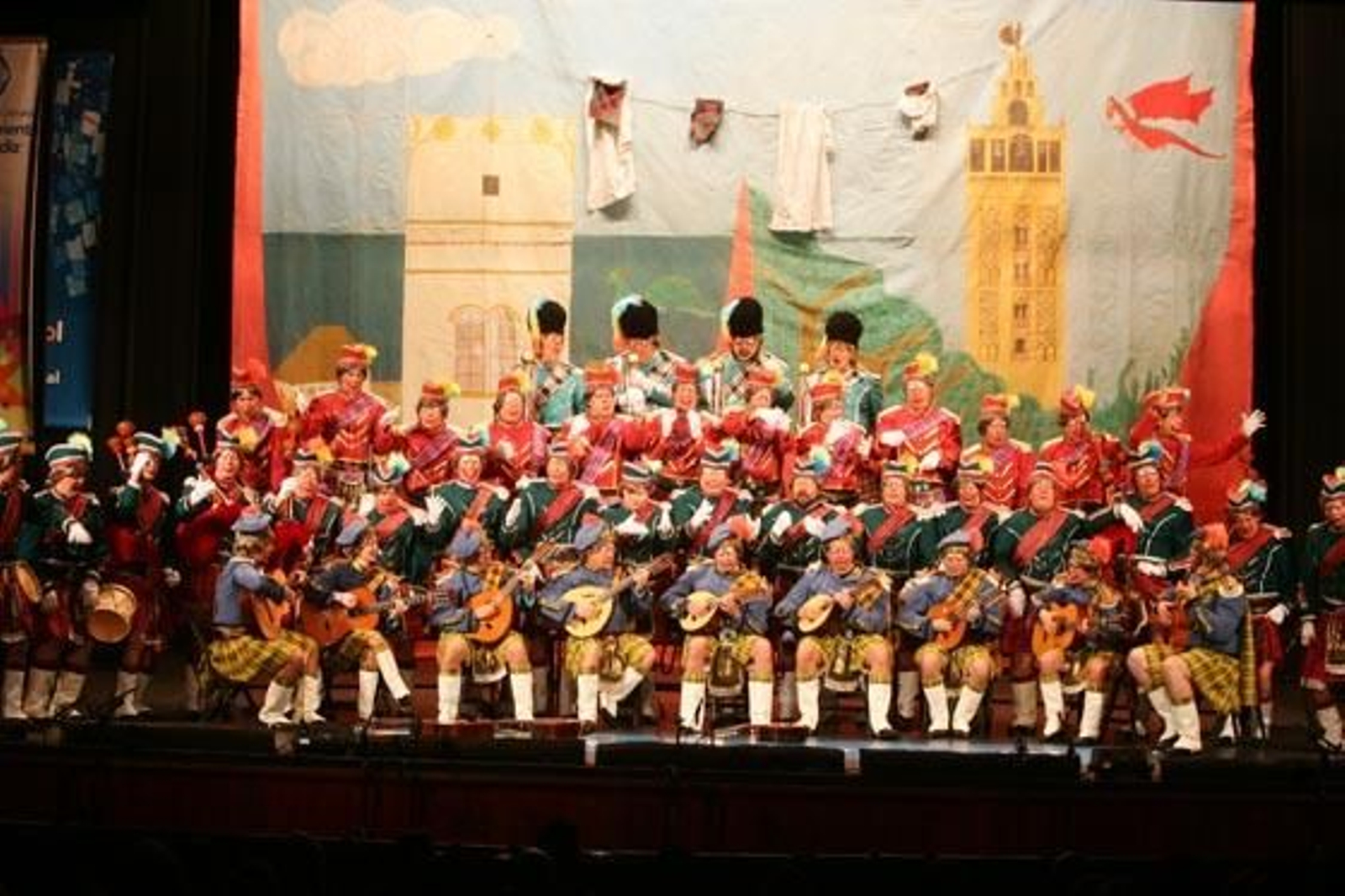 El telón del Falla se abre por primera vez en la noche para acoger a este coro sevillano, que representa el tipo de payasos escoceses, con gaitas y todo. Agradan mucho al público con sus tanguillos aunque pierden fuelle al final. Nota:*