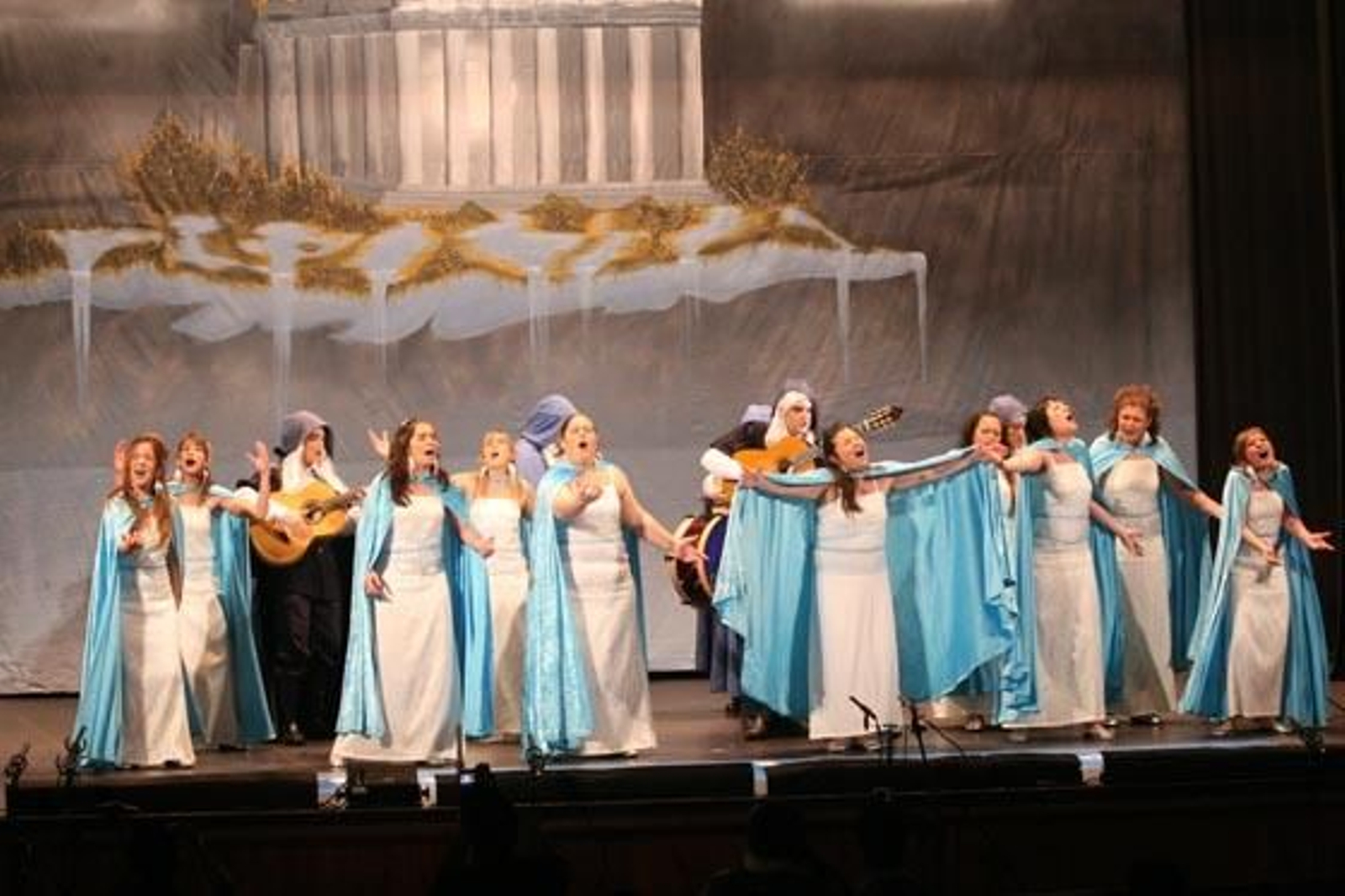 Desde El Puerto de Santa María llega una comparsa mixta con el tipo de divinidades griegas. Estas jóvenes comparsistas reivindican el papel de la mujer en la fiesta, ganándose un buen número de aplausos. Nota:*