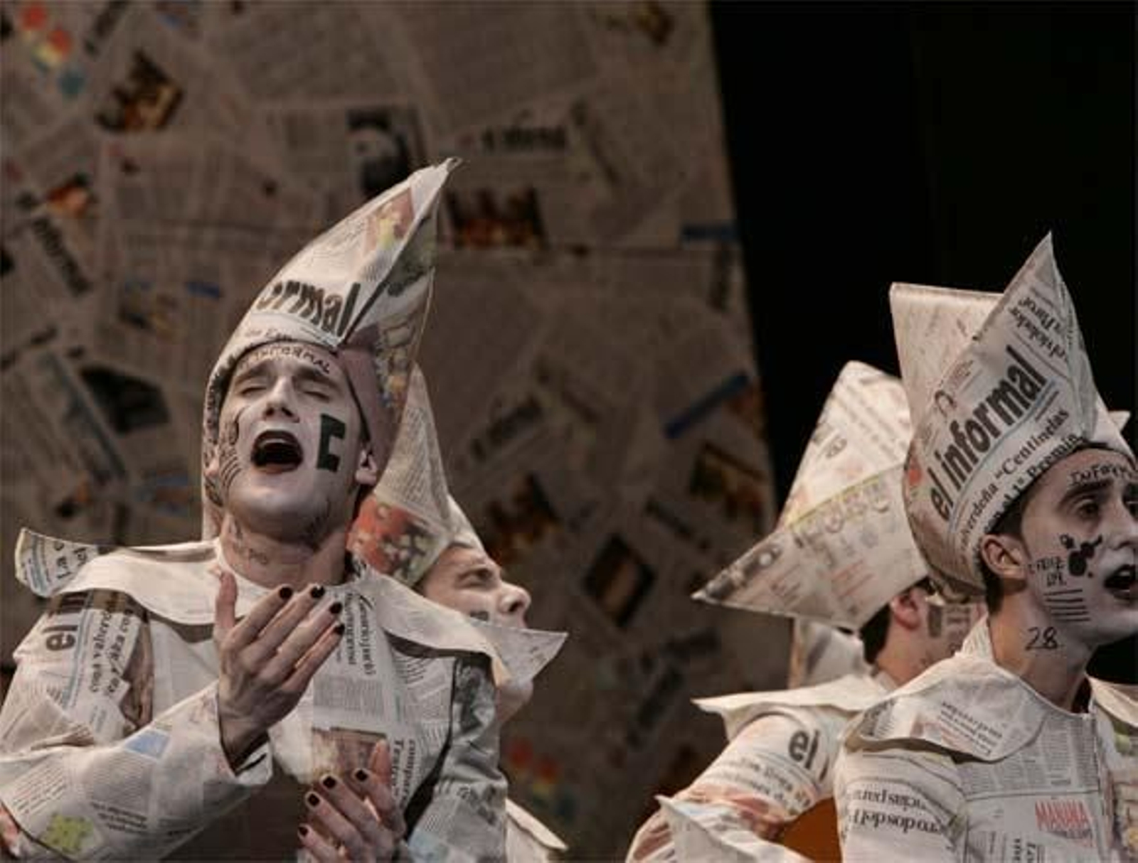 Bonito forillo el de la comparsa de Valverde del Camino, dominado por un ejemplar de un periódico cuyo título da nombre a la agrupación. Su tipo está formado a partir de ejemplares del propio periódico, similar al tipo del coro Papelandia del pasado año. Muy bien de afinación y voces esta comparsa. Un poco difíciles los pasodobles. El primero a la droga, y el segundo, que empieza hablando de la victoria de España en la Eurocopa, acaba con la ley de Memoria Histórica. Un poco liosos, la verdad. Primer cuplé para la Duquesa de Alba y segundo a su afición a las ferias de pueblo. Flojitos. Regular el popurrí, por debajo del resto del repertorio en afinación. Cambian de tipo poco antes de terminar, cambian su gorro de papel por un bombín rojo y una nariz de payaso. El popurrí se hace largo, la verdad.