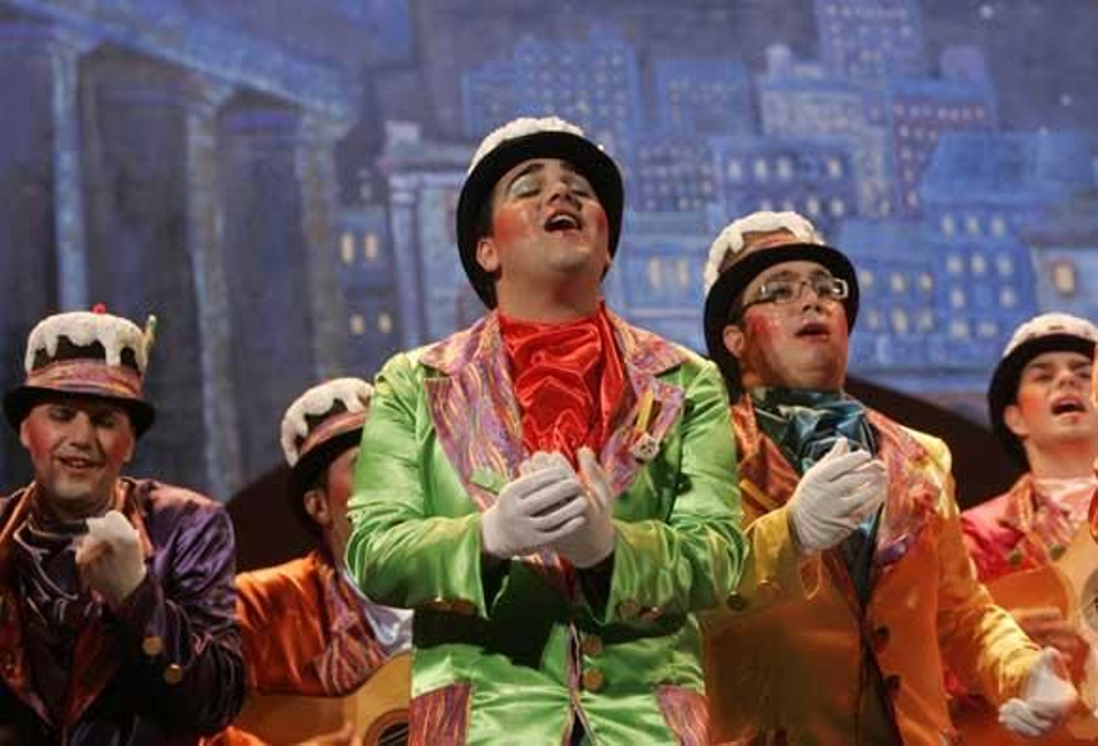 Espectacular puesta en escena de la comparsa chipionera, que recrea un gran parque de atracciones repleto de golosinas. Ellos son una especie de Willy Wonka en este peculiar parque de atracciones. Mucha potencia y bien afinada esta comparsa, que cuenta con mucho apoyo en la grada. Reparten golosinas entre las ninfas... se ganan nueve fans incondicionales... Primer pasodoble a la historia de un viejo coplero que aún mantiene viva la llama del Carnaval. Segundo para la sangre andaluza, que comparan con la sangre vasca. Son dos formas de entender el nacionalismo. Muy aplaudida esta copla. En el primer cuplé buscan un disfraz que de miedo para su chiquillo... ni de bruja ni de vampiro, lo disfrazan de hipoteca y ganó el concurso. Gran cuplé. Segundo al entierro de Michael Jackson, también bastante bueno. Sorprenden con una gran tanda. Agradable sorpresa la de esta comparsa. Por debajo del resto el popurrí, aún así sorprenden gratamente estos comparsistas. Golpe de efecto final, se apagan las luces y al volver son niños los que ocupan las tablas.