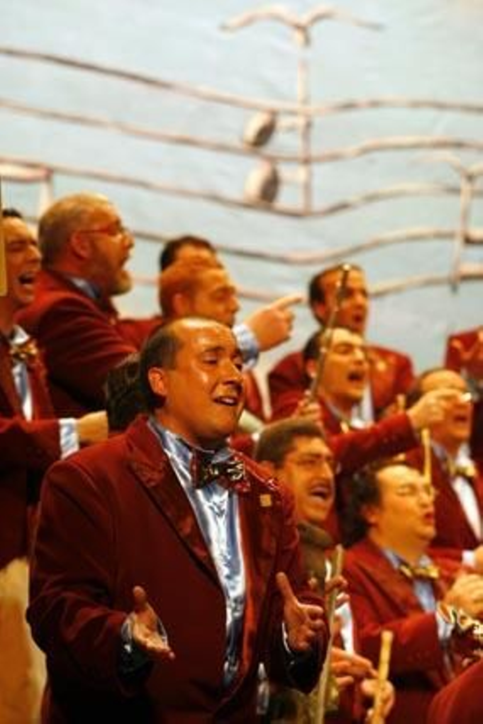 Abre la segunda parte de la sesión el coro de Fali Pastrana y Quico Zamora. ¡Ya suena Cádiz! Preciosa presentación de esta agrupación, con un grupo de voces envidiable. Primer tango superada ya la medianoche. Precioso homenaje a Antonio Martin y Pedro Romero, dos copleros de gran categoría que llevan ya cuarenta años cantando a su tierra. Ironía y mucha crítica en su segunda letra, en la que acusan a la alcaldesa de interesarse sólo por la limpieza de la playa, cuando hay muchas más cuestiones que afectan mucho más a la sociedad. Pieza de afinación antes de los cuplés, y en esta ocasión con sorpresa. Sale a escena Manolito Santander ataviado igual que el coro para dirigir la pieza, el famoso pasodoble de la Familia Pepperoni al Cádiz C.F. que es ya el himno no oficial del equipo amarillo. "Me han dicho que el amarillo...". El teatro se viene abajo tras este momento. Vamos con los cuplés, primero para una discusión de pareja y segundo para la afición de la alcaldesa al Carnaval... Precioso popurrit, un conjunto de voces impresionante y un uso muy bien seleccionado de instrumentos.