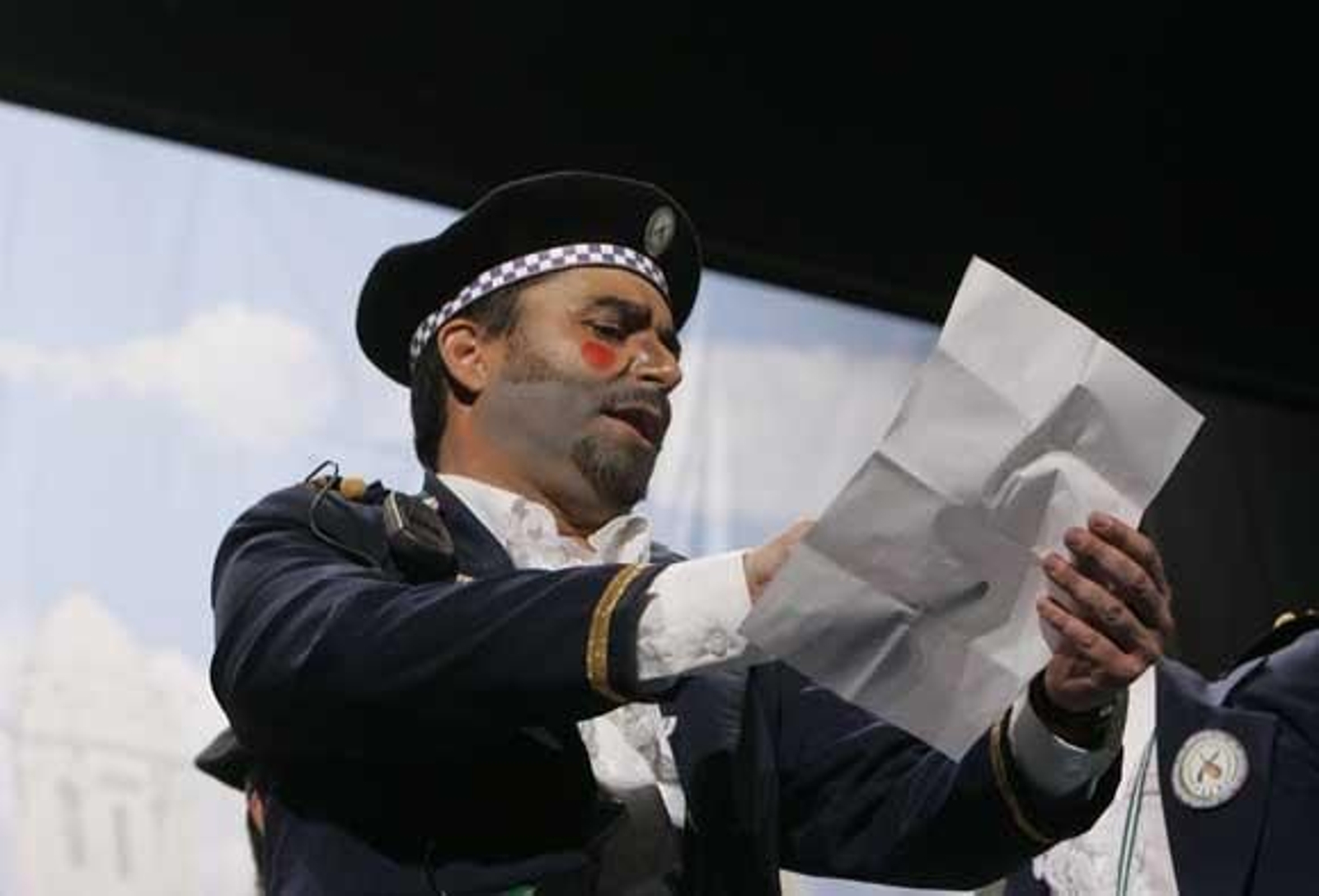 En cuartos: Ahí está la pasma, polizía autonómica andaluza. En el primer pasodoble cuentan que ellos apuntaban desde pequeños para la policía y tenían claro quiénes eran los malos. Buenos puntos y mucha ironía, remate serio. Segundo para el secuestro del Alakrana (o Arakalakana, seguro que ha sido Martínez Ares que a Juan Carlos no lo traga), qué cachondeo. Remate serio, en la línea de lo oído hasta ahora en el concurso... Vaya dos pasodobles con arte, tremenda la música, que le viene perfecta al tipo. Primer cuplé, genial, en el que cuentan como ficharon a Juan Carlos Aragón como letrista. Varios golpes en el mismo cuplé. En el segundo van de chófer con la alcaldesa y se atraganta... otro grandísimo cuplé. Detalles simpáticos en el popurrí, su punto fuerte fueron los pasodobles y los cuplés.
