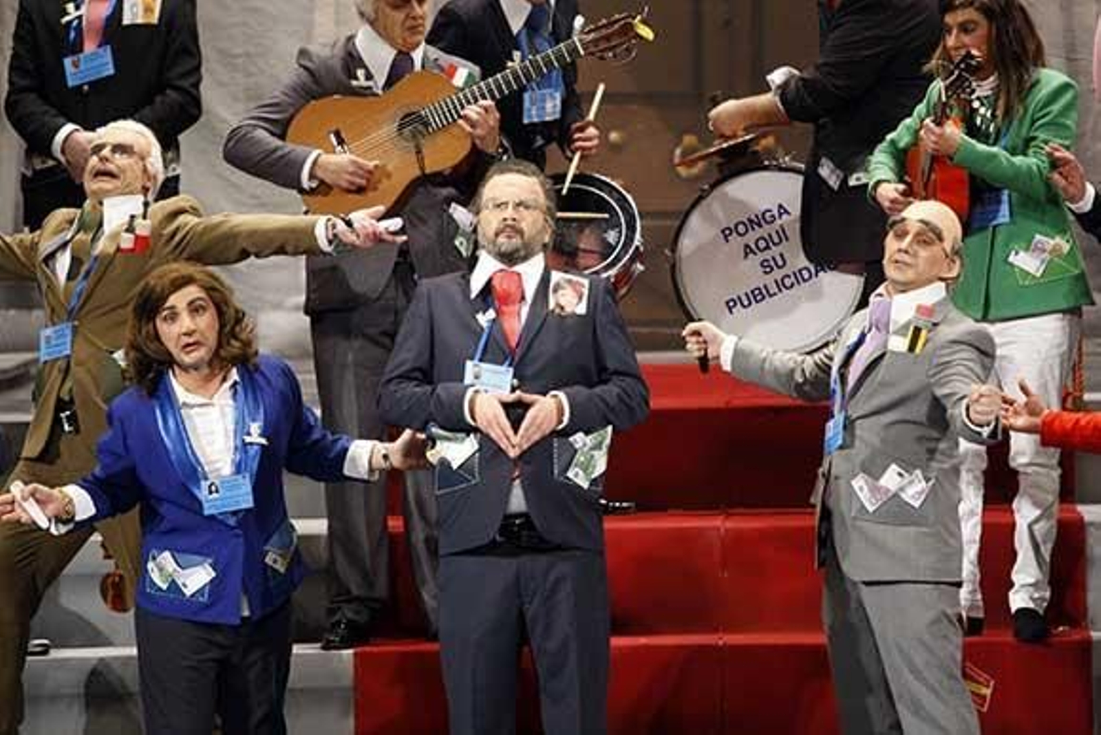 El aire de musical no nos abandonó, con la salida a escena de la comparsa mixta Un musical en crisis. Letras con intención y mucho futuro por delante el de este joven grupo. El teatro era una caldera a la espera del tercer premio de chirigotas del año pasado, Esto sí que es una chirigota, de Vera Luque, recibidos con el ya inmortal cántico de Los hinchapelotas. Desde que subieron cortinas se veía venir que algo grande iba a pasar sobre las tablas. El tipo, genial, clavando a los ministros del Ejecutivo de Mariano Rajoy -encarnado en el propio autor- aventuraba lo que sería un repertorio de altura, repleto de buenos golpes, crítica e ironía. A destacar los cuplés, muy originales, a las activistas de Femen y a la obligación de las ninfas a venir con el traje de piconera desde el primer día este año, y un popurrí que mezcló con acierto el humor con la reivindicación. No engañaban. Eso sí que es una chirigota.