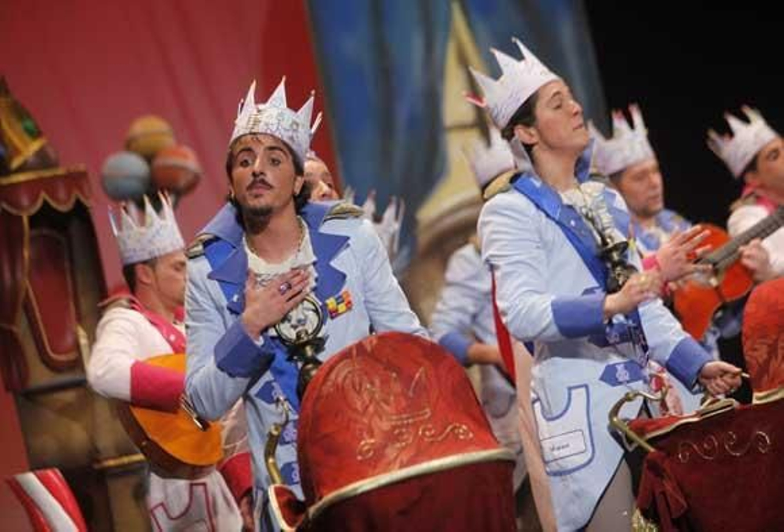 En preliminares: La joven comparsa de Barbate trae un imaginativo tipo, de padres primerizos. Su disfraz tiene unos detalles muy cuidados, un punto a su favor. Dedican sus pasodobles a los niños de ayer y a los de hoy, recordando su infancia allá por los 80 y comparándola con la realidad de hoy, y al flamenco y su nombramiento como Patrimonio Inmaterial de la Humanidad. Mejor el primero. Cuplés para la falta de intimidad con su señora desde que nació su niño y para la ley antitabaco, también mejor el primero y ambos con un estribillo muy chirigotero. Buen popurrí, con la afinación como su punto fuerte. El grupo no es excesivamente potente pero canta muy bien y es muy agradable de escuchar.