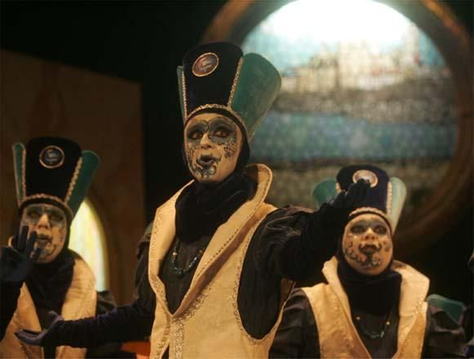 En preliminares: Una vidriera con la imagen de Cádiz se ilumina al fondo justo antes de arrancar la presentación. Precioso el tipo, pero bastante difícil de describir... una especie de abad de su particular catedral. Ya no está momo, pero ellos son los elegidos para seguir su palabra. Qué barbaro. Vaya presentación, musicalmente y en voces impresionante. Primer pasodoble a la presentación del Carnaval en Madrid, muy crítico con el presentador, el lío de las entradas... Un evento que sólo salvaron las agrupaciones, que al fin y al cabo son las importantes en la fiesta, para qué más. Gran letra. El segundo pasodoble cuenta la historia de un hombre que sufrió en su propia familia los horrores de la guerra y ahora busca los restos de su padre, fusilado durante la Guerra Civil, para que pueda descansar a la vera de su madre. Gran ovación a esta letra. El año pasado fueron campeones...pero no hablan del concurso, sino de la Eurocopa. Se veía venir, pero aún así bien llevado el cuplé. Segundo para Esperanza Aguirre, que se salvó de milagro de un atentado en Bombay...si le hubiera pasado a Fraga, nada más que andando hubiera esquivado todas las balas. Buen cuplé y muy bonito el estribillo. Misa carnavalesca, canción protesta para el popurrí. Aquí lo dejamos escapar todo, menos el Carnaval...cambiamos empleos por cursillos, ya nos alimentaremos de papelillos... Palabras de momo, las que dejó antes de ser quemado, que defienden con mucha pasión. Conservan todos las virtudes que mostraron el pasado año con La comparsa de momo: letras ácidas, críticas, grandes voces y mucha pasión para defender sus coplas.