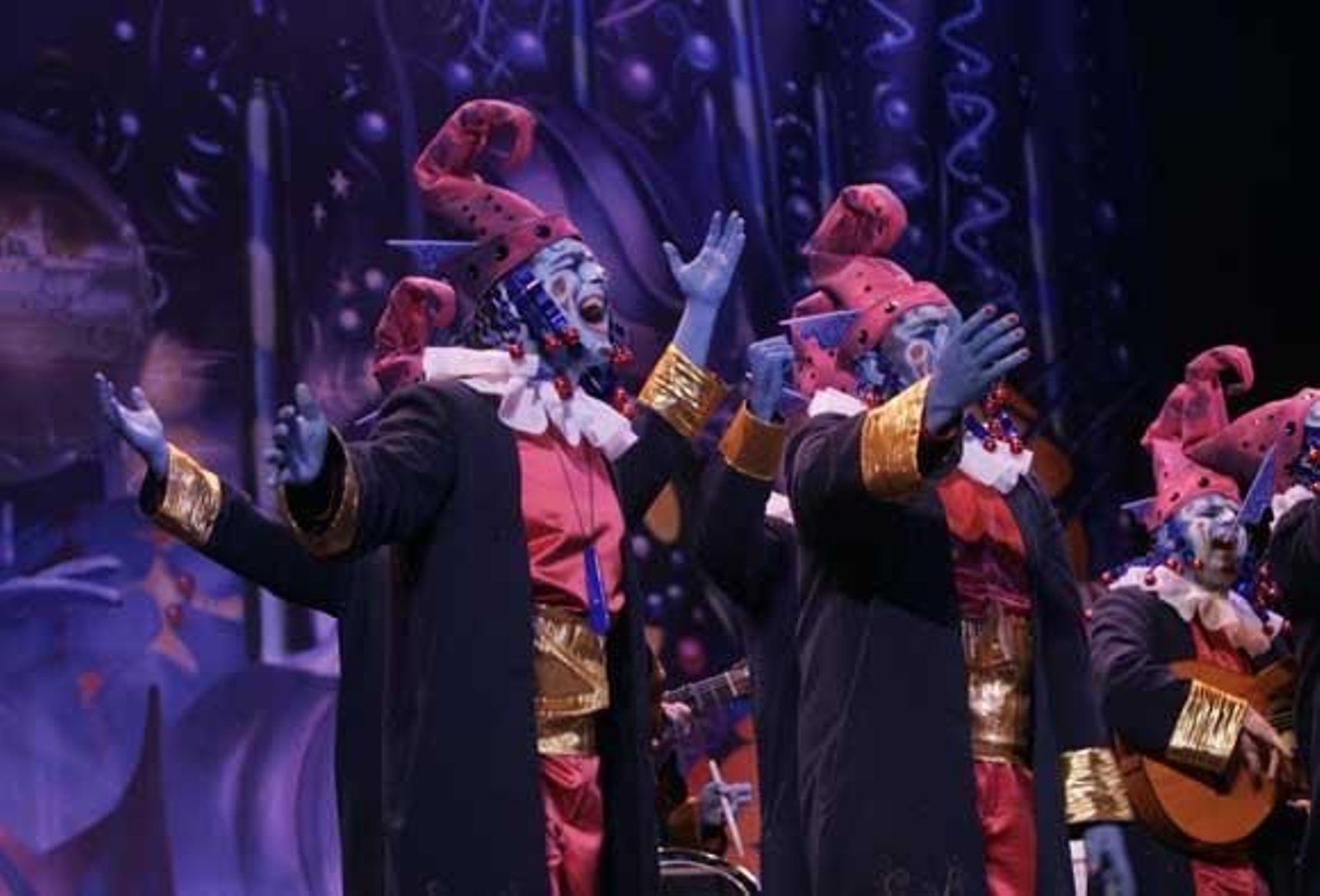 Tipo de fantasía, una especie de duendes del sueño, para estos debutantes jiennenses, apoyados por muchos paisanos en el graderío. Nos mandan soñar con el Carnaval. Ciertos excesos de voz que les hacen perder el compás. Le ponen ganas, eso sí. Pasodoble musicalmente bastante largo, el primero dedicado al sueño de cantar en el Falla. Cuplés a los sueños de los famosos y a la 'chirigota de los famosos' que se estrena hoy en el Falla, rematados de igual manera. Demasiadas estridencias en el popurrí, no están convenciendo y comienza el jaleo en el gallinero. Vamos a dejarles terminar, hombre. Acaban entre los aplausos de los suyos.