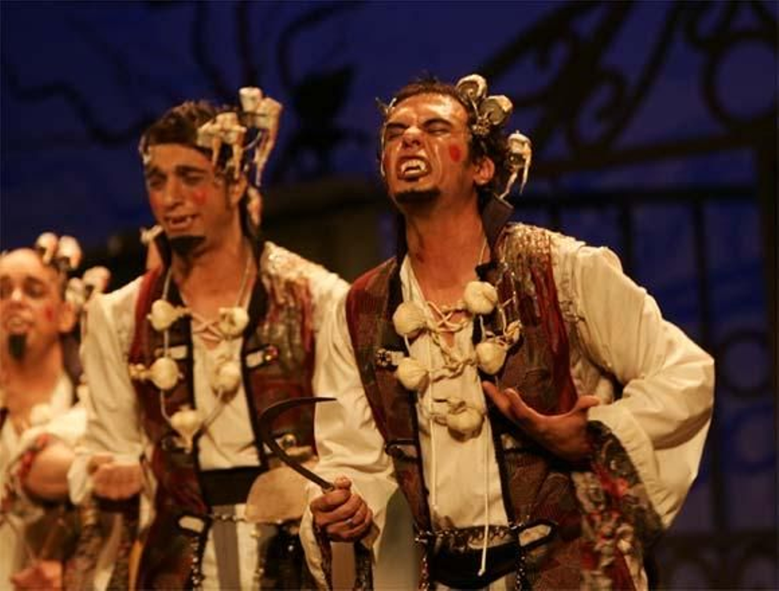 Tipo de vampiros para la comparsa de Jesús Bienvenido. Estilo alegre y sello inconfundible el de estos vampiros románticos y guasones de Bienvenido. Salen dos esqueletos a bailar con ellos, gran detalle. Gran presentación, perfectamente afinada. Preciosa música de pasodoble, además muy difícil de interpretar, con muchos cambios. Pero ellos la bordan. Gran primera letra, enlazando con su tipo del pasado año. Pedazo de letra la segunda, al conflicto palestino-israelí. Conducen, a través de la historia de un padre que dice a su hija que se esconda como un juego, la dureza del conflicto. Simpático el primer cuplé, en el que se confiesan fans del Duque, y segundo a su suegra, que le ha cogido mucho cariño a un cerdito. Estupendo también el estribillo, de nuevo con el sello inconfundible de la comparsa. La música, una delicia. Magnífico popurrí, musicalmente excelente, con aires chirigoteros. Da gusto oírles. Comparsón, de nuevo aspirantes a lo máximo. El público les despide en pie.