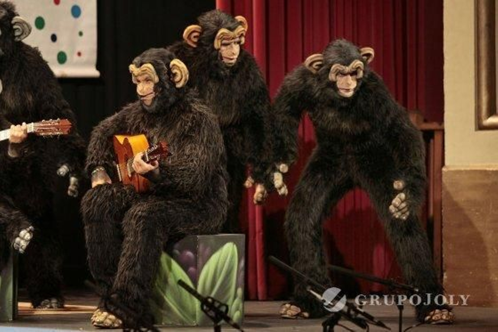Las coplas. Nuestros antepasados se presentan alegres, haciendo monerías, y deseando contagiar su "mono de Carnaval". Tras la delicada falseta (para la que me faltan ya adjetivos para ensalzarla y no repetirme) llegan los tangos críticos. El primero de ellos critica la marca España pues, para ellos, la verdadera marca España es la marca de la enseñanza, para la que no nos llega el dinero con las nuevas tasas; la marca de un Parlamento desfilando por los juzgados; la de un presidente bailando al son de Merkel; y la plusmarca de los seis millones de parados que campan por este país. Bastante bien hecho. En el segundo, muy al tipo, no entienden dónde está ese "genoma del mal" que se ha insertado en el hombre. Mira que compartimos genes con ellos pero estos tratarabuelos no matan a sus parejas, no dan veneno a sus hijos adoptivos ni los queman, no levantan alambradas, no dejan morir de sangre a otro por ser diferente color... "El ser humano se convirtió en un maldito mono cuando evolucionó", rematan. En el primer cuplé se quejan de lo difícil que es escribir por whatsapp. Se escribe con una chica y cuando la conoce en persona, pues habla igual que escribe. Los actos incívicos que se cometen en la semana de Carnaval se llevan el segundo pasodoble donde presumen de su hombría. De hecho, hay por ahí quien viéndolo miccionar en la calle le ha gritado "eso sí que es un pedazo mono". Bueno, reguleros... La interpretación es el talón de Aquiles de los monos que hacen un digno pase pero, quizás, insuficiente para avanzar un peldaño más.