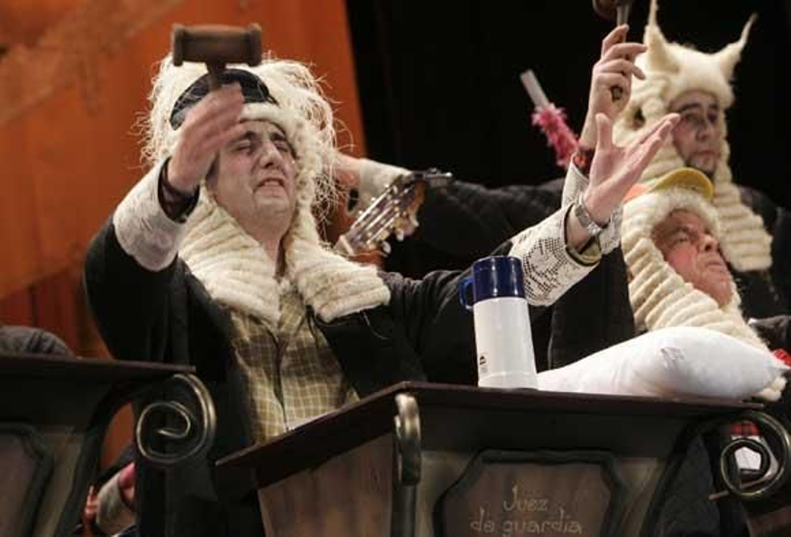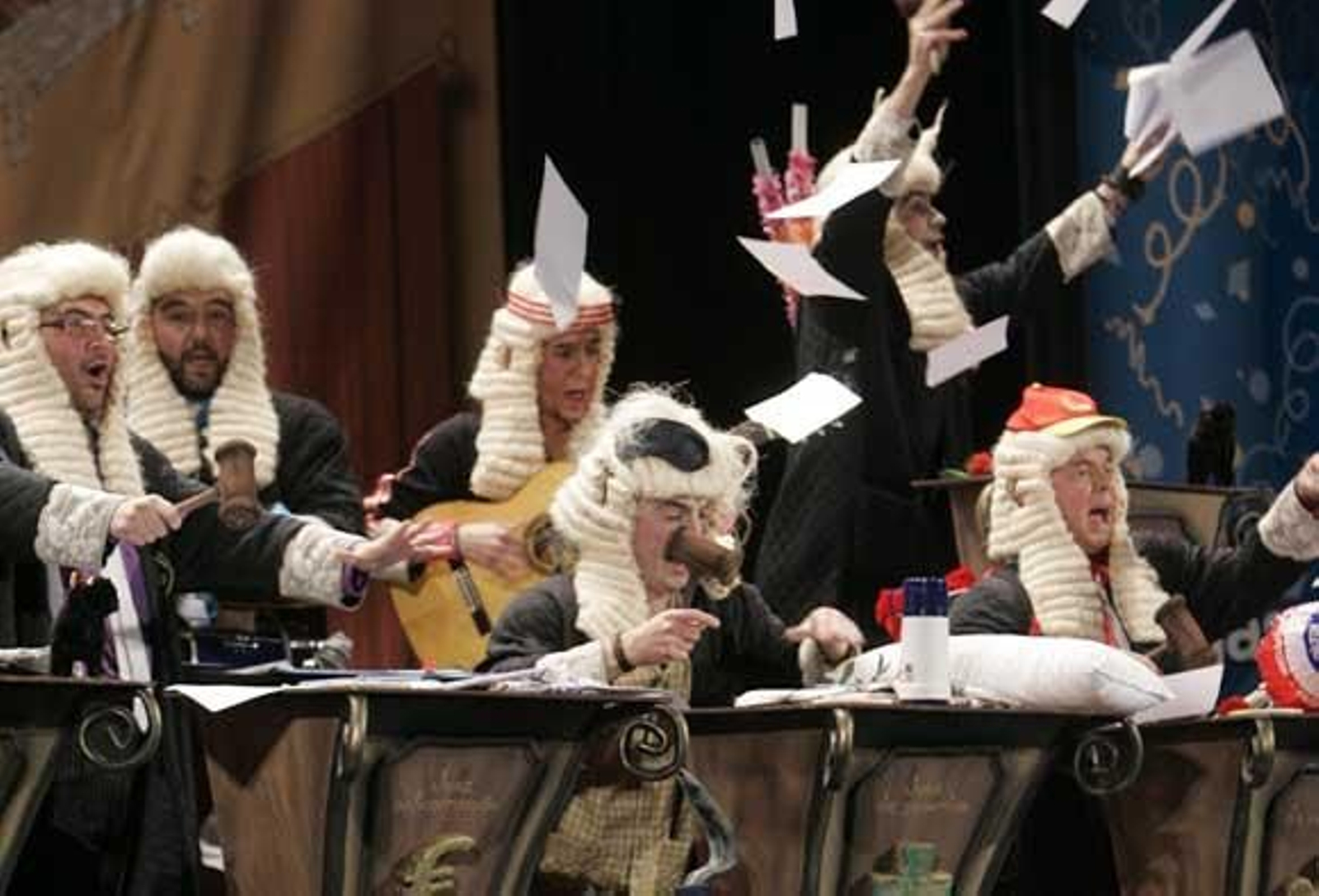 En preliminares: Tipo de magistrados para los chirigoteros del Vera, que recrean un juzgado, con sus diferentes departamentos, en plenas tablas. Teófila y Vicente Sánchez, cual capilla Sixtina en el forillo, grande. Se presentan los miembros del tribunal, cantando de categoría. Hoy les juzga el más supremo de todos los tribunales, el Falla. Sólo conocen el veredicto de la gente en la calle, su única sentencia es la de su pueblo. Buen pasodoble. Segunda letra a la chirigota de los famosos. Les advierten que no es un capricho, hay mucho trabajo de fondo para poder decir que son chirigoteros. Muy aplaudida esta letra. Primer cuplé para la gente que le piden que saquen una comparsa. Si su chirigota no tiene puntos, pues menos tiene el Xerez y aquí la gente se descojona. Segundo para el afeitado... también bueno. ¿Quién decía que esta chirigota no tenía gracia? A ver el popurrí. Buenos golpes, apenas si pudo oírse el principio de la última cuarteta por las risas del público. Espectacular despedida que le brinda el teatro.