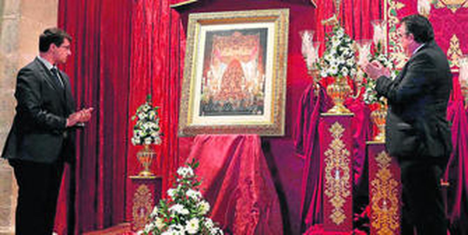 En un escenario profusamente adornado y exornado con flores de color blanco sobre fondo rojo, Andrades invitó a acompañarle al alcalde de la ciudad, Enrique Moresco, y al autor de la fotografía ganadora, José Manuel Castilla Gallardo, para que descubrieran el cartel que hasta entonces permanecía oculto.
