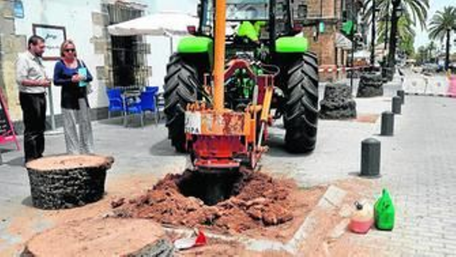 Para los trabajos se utiliza una máquina que elimina el tocón de la palmera y desbroza las raíces.
