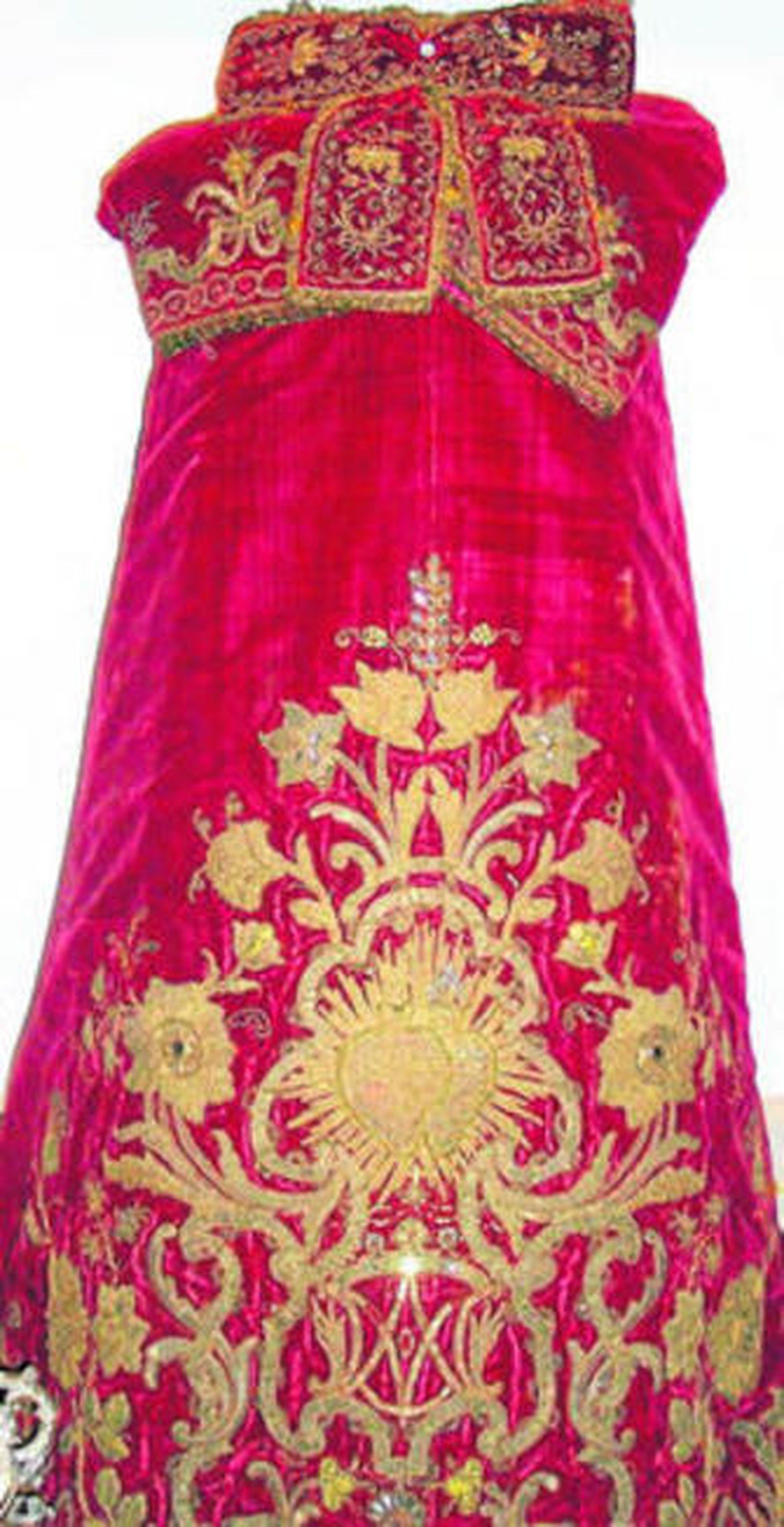 Con las labores de esta saya guardan relación asimismo otras prendas que también conserva la hermandad: un fajín granate y un manto de terciopelo verde muy deteriorado, razón que ha imposibilitado su salida cubriendo la titular, aunque sí lo ha lucido la imagen en el quinario extraordinario recién celebrado en la Prioral.