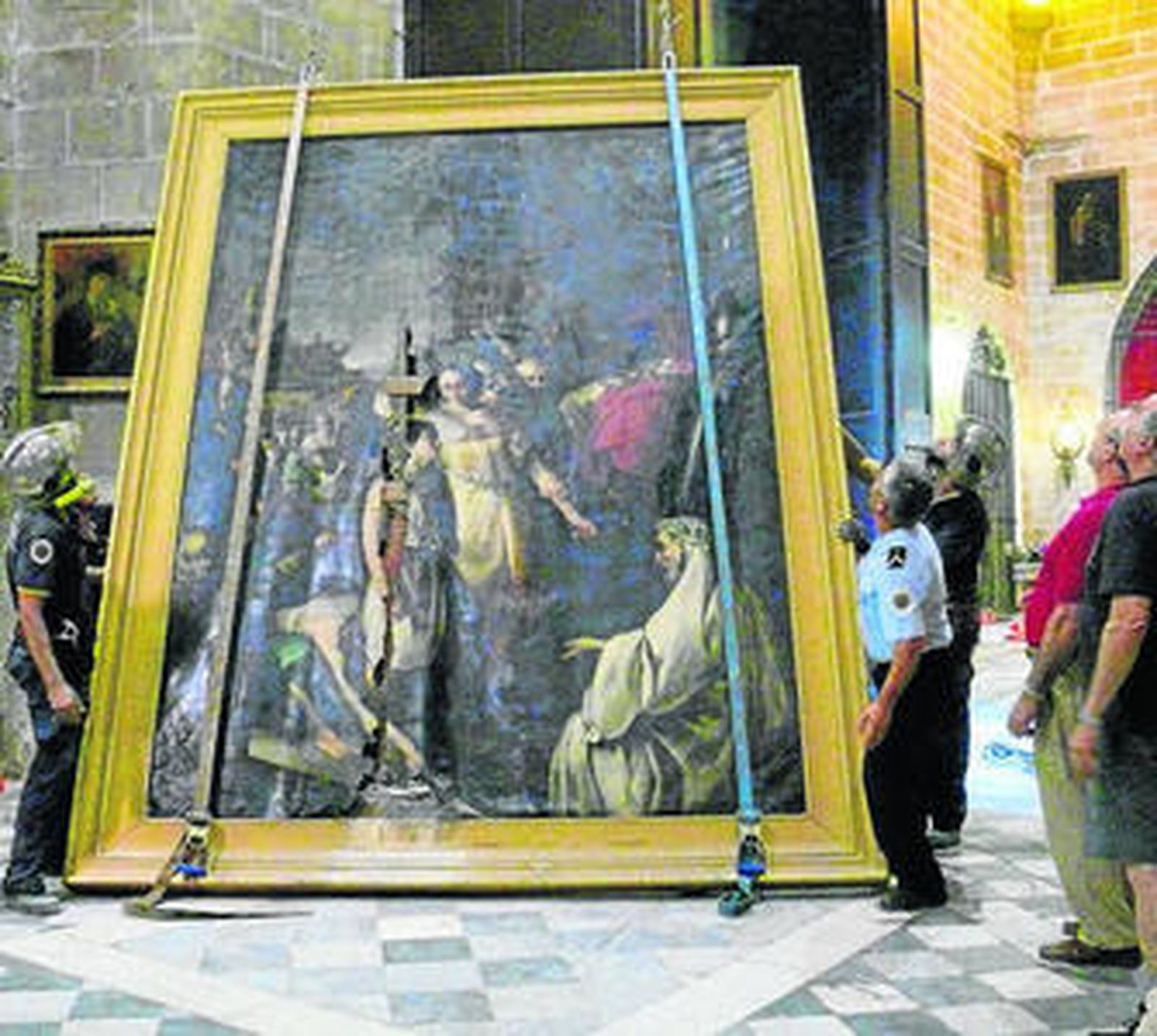 Bomberos voluntarios participan en una delicada maniobra para bajar del trascoro de la Prioral la 'Madre de los Macabeos' · Bellas Artes financia la restauración de la pintura