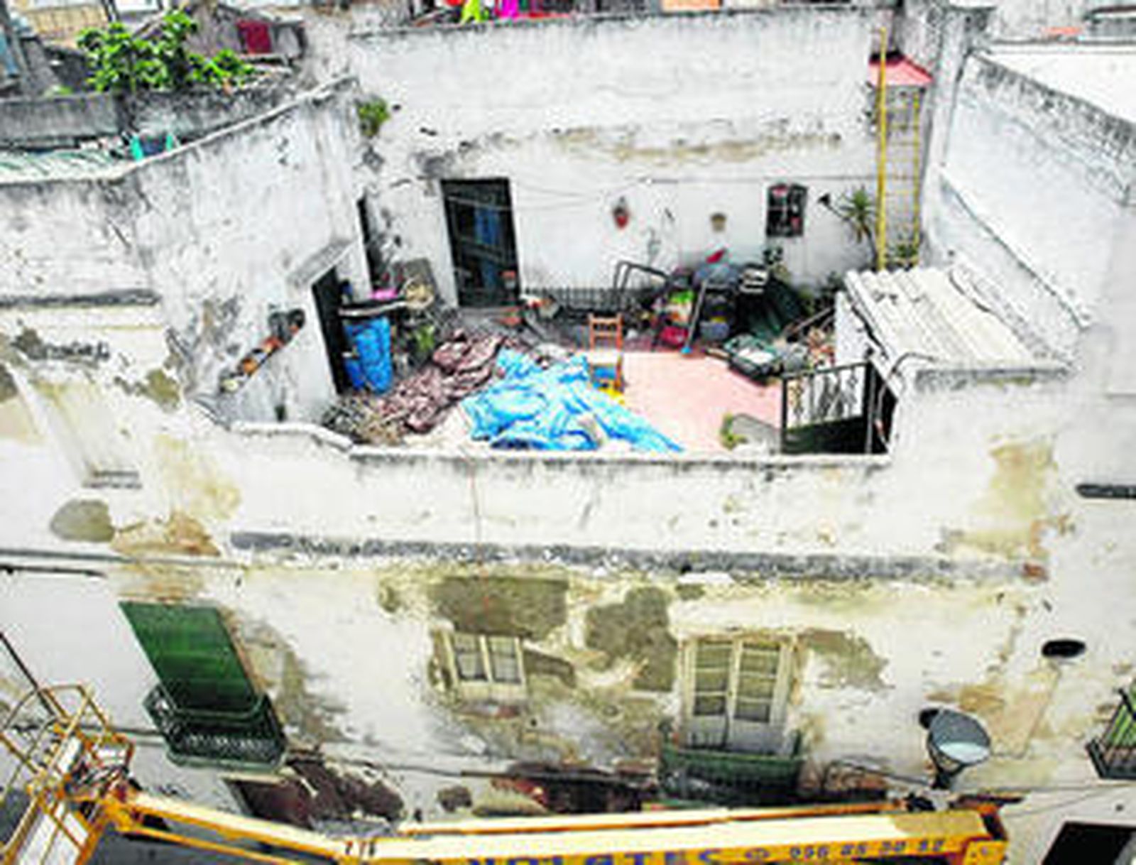 Los vecinos del número 4 de la calle Santa María, que sufrieron el pasado viernes el desplome de dos pisos de la finca en la que viven, siguen aún muy preocupados por el estado que presenta no sólo su edificio, sino también una casa situada justo enfrente que se encuentra en muy mal estado y que amenaza ruina. Algunos de los vecinos no están durmiendo en el edificio, aunque sí permanecen en él durante el día, ya que no se fían de la inspección realizada por los servicios municipales y han encargado un peritaje privado que les alerta del mal estado en que se encuentran todas las cubiertas del inmueble. A esta preocupación se añade ahora el estado de la finca situada justo enfrente, una casa prácticamente en ruinas en la que vive una familia con niños. El Ayuntamiento es consciente desde hace mucho tiempo del mal estado que presenta esta casa y desde el servicio de Disciplina Urbanística han tratado de comunicar a los inquilinos de la casa la necesidad de acometer de inmediato obras de mejora. No obstante, esta notificación no ha sido posible hasta ahora, a pesar de que la familia vive en la casa, por lo que el inmueble sigue igual para disgusto de los vecinos cercanos, que temen que pueda ocurrir otro derrumbe.