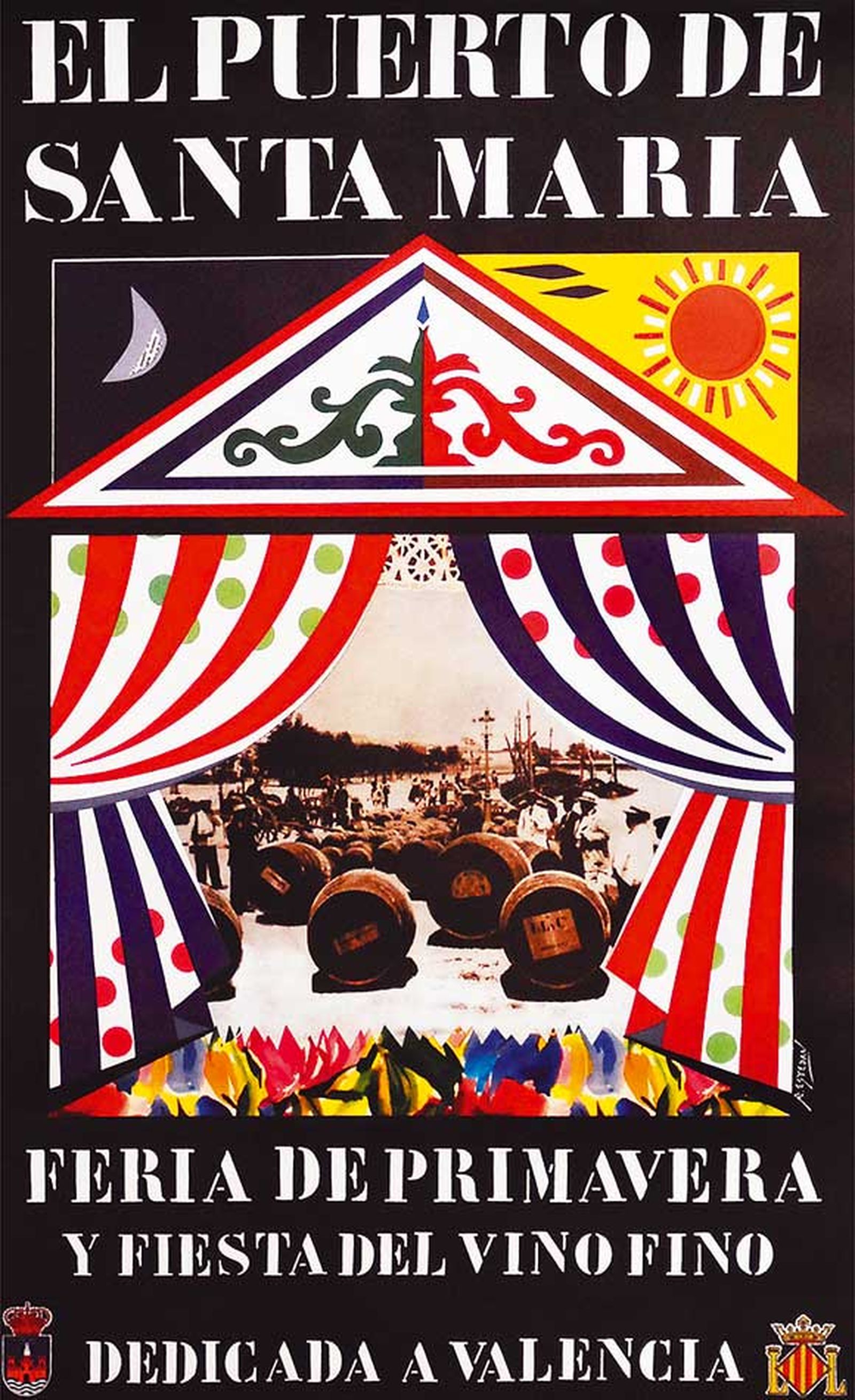 Un color que da paso a su antítesis del blanco de la tipografía. Una tipo genuinamente bodeguera, reconocida por todos en esta zona del sherry, pero sobre todo bien conocida por tantos arrumbadores y toneleros de oficio que la han utilizado en las planchas de cinc con el que están hechos los moldes, para dejar indeleble en las botas las marcas señeras constituidas por apellidos anglosajones, galos y españoles históricamente arraigados. Osborne, Domecq, Gonzalez-Byass, Terry, Grant, Harvey, Sánchez Romate… entre tantos. Un mundo, a la sazón, perfectamente representado en la escena de la fotografía central del cartel, que a modo de resumen sintetiza la importancia del comercio vitivinícola, en un paisaje urbano, donde el río Guadalete, el río del olvido, demuestra su importancia como medio trasmisor en el vasto trasiego mercantil que durante siglos ha existido en la zona. Una imagen que se ha podido sacar de ‘La Bodega’ del novelista valenciano Vicente Blasco Ibáñez, que hoy está más cerca si cabe de nosotros. Con manifiestos personajes de camisa remangada, otros con sombreros que aportan buena cuna, y algún aduanero uniformado fiscalizando arrobas. De esta guisa, la que nos abre esa puerta histórica y antropológica, es la caseta de feria, con un manto de flores que coge desprevenida a la primavera. Un elemento no siempre representado en el cartelismo local, que Esteban Poullet ha querido utilizar como signo de simétrica dualidad por la condición diurna y nocturna de nuestra Feria. La caseta es el lugar común propio por antonomasia de los portuenses. Espacio embrionario de la concordia, donde por arte de la metáfora quedan ensambladas año tras año las peculiaridades de una ciudadanía, que le da sentido a la amistad, en torno a media botella de Fino y un buen surtido de pescado frito. De un lado iluminado por un sol masculino, bosquejado como la naranja levantina sacada del mismísimo Jardín de las Hespérides, y que con suntuosa brillantez hace relucir de manera especial el albero del ferial, al compás firme del paseo de caballos y del baile por sevillanas. Un día reglado para compartirlo con la familia y los compañeros de ruta. De otro, una luna femenina en cuarto creciente, que observa omnipresente los designios de la noche, de un espectáculo traslaticio que no descansa desde medio día. Una noche para los enamorados, para los amigos, pero de otra manera, que saben festejar a Dionisio o Baco, encontrando en el mismo Jardín alguna fruta pecaminosa que compartir.
