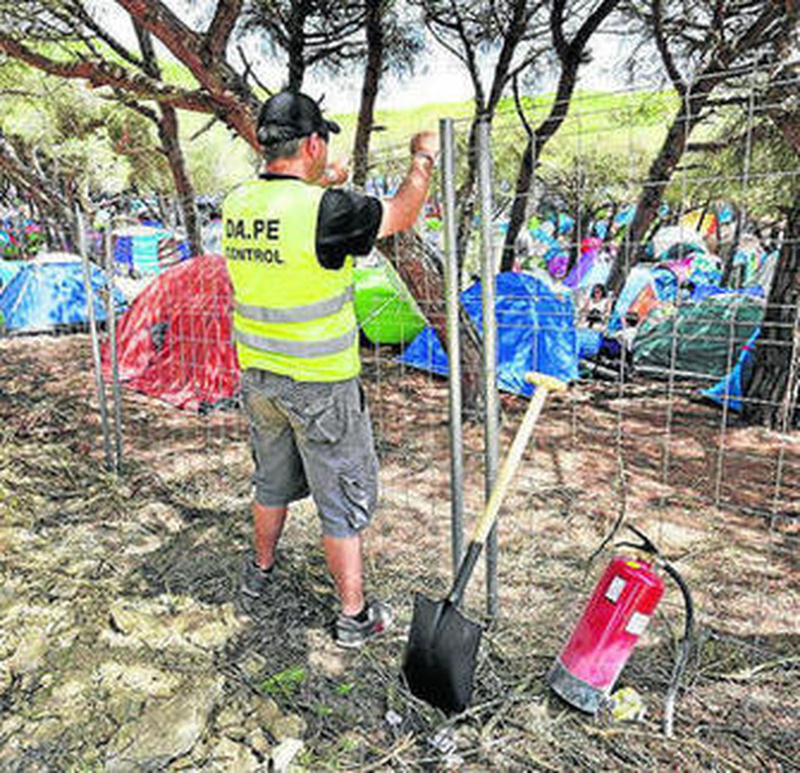 Acompañados por Antonio Romero, uno de los responsables del festival visitamos la zona de acampada Atlas. En un pinar suburbano bastante seco, con áreas hasta hace poco con escombros y colindante más arriba con el parque natural, se apiñan cientos de tiendas de campaña de las de lanzar y montar. Alojarán a miles de personas. Antonio segura que se ha retirado gran cantidad de basura, que disponen de su propio servicio de reciclaje y retirada -incluso en la playa-, que se ha abierto un cortafuegos y un camino perimetral y en que hay previsto un plan de prevención y evacuación en caso de incendio del que se ha informado a los visitantes mediante carteles y folletos. Preguntamos a un grupo de festivaleros que nos pide una foto. A estos no les suena lo del folleto. Antonio insiste en que disponen de extintores y de palas y en que también estará en activo el dispositivo del Plan Infoca. Pero sobre todo, en que han "cumplido con todas las medidas correctoras que impuso la Junta Local de Seguridad, en especial la apertura de un camino perimetral por donde pudieran entrar bomberos y ambulancias". Por esto les pueden caer 240.000 euros de multa.
