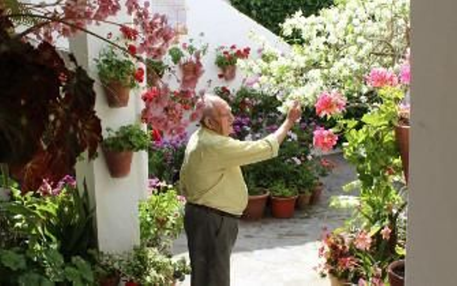 Manuel Crespo muestra sus flores y plantas. Cada día, a su 78 años de edad, Manuel riega a cada una de ellas, tarda sobre hora y media, dice. En la Casa del Mayorazgo, donde vive, limpian el patio todas las semanas y encalan cada dos años aunque, cuenta Manuel, hay que hacer algún arreglito cada cierto tiempo, un desconchón, un poquito de repellado por los bajos... Lo cierto es que da alegría entrar. Pasan turistas cada dos por tres y echan algo en la hucha. "El otro día vinieron siete u ocho autobuses", asegura. Este laborioso trabajo tiene su premio. Ha ganado el concurso de patios de Vejer en el que había más de una veintena de participantes.