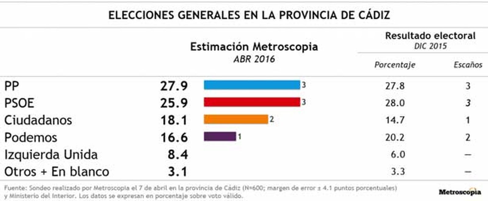 Tanto el PP como el PSOE seguirían siendo, con amplia diferencia, las dos fuerzas políticas que más respaldo recibirían por parte de los votantes gaditanos en el caso de que hubiera elecciones generales el 26 de junio. Los dos partidos mantendrían sus tres escaños en el Congreso de los Diputados, aunque los populares pasarían a ser ahora los más votados. El 20 de diciembre el PSOE se llevó la victoria al superar a su principal adversario por un margen estrechísimo de apenas 1.600 votos. El PP, que logró el 27,8% de los votos válidos emitidos, se quedaría prácticamente igual, ya que la encuesta de Metroscopia le otorga ahora una estimación de voto del 27,9%. Por su parte, los intentos de Pedro Sánchez por intentar conformar un gobierno no le reportarían beneficios a su partido, el PSOE, en Cádiz, donde a priori sufriría un descenso -aunque no muy amplio- cifrado en dos puntos porcentuales. En concreto, el Partido Socialista se quedaría ahora con un respaldo del 25,9% del escrutinio, cuando en diciembre logró el 28%.
